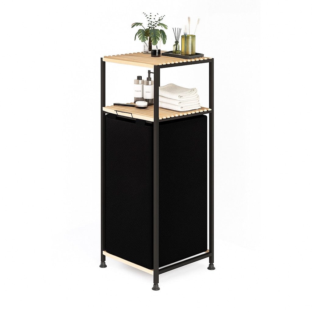Lieferumfang | 1 × Metallrahmen (schwarz), 2 × Naturholzregalböden, 1 × Herausnehmbarer Stoffkorb (schwarz, 40 L), 1 × Montageset mit Schrauben, 1 × Aufbauanleitung |
