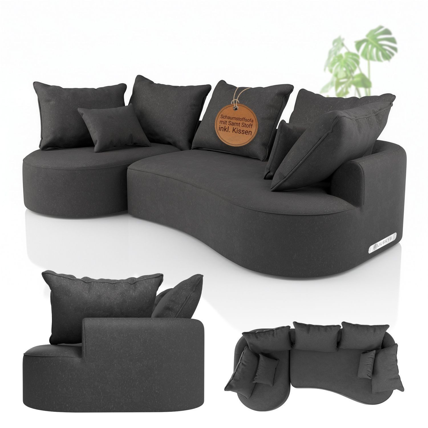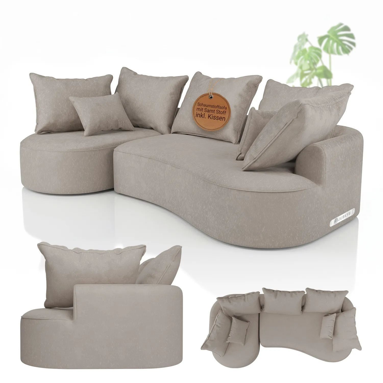 Das Sofa Tirano überzeugt mit abgerundeter Linienführung und einer weich geschwungenen Silhouette, die moderne Wohnräume bereichert. Seine großzügige Sitzfläche mit fester Schaumstoffstruktur bietet dir Stabilität und Gemütlichkeit zugleich. Der Bezug ist wahlweise inedlem Samt oder weichem Boucléstoff erhältlich, während abnehmbare, waschbare Kissenbezüge die Pflege im Alltag erleichtern. Belastbar bis 500 kg und ausgestattet mit bequemen Rückenkissen und dekorativen Kissen, schafft Tirano den perfekten Ort für Familienzeit, Besuchvon Freunden oder entspannte Momente nur für dich. Ein Sofa, das Design und Komfort harmonisch vereint.