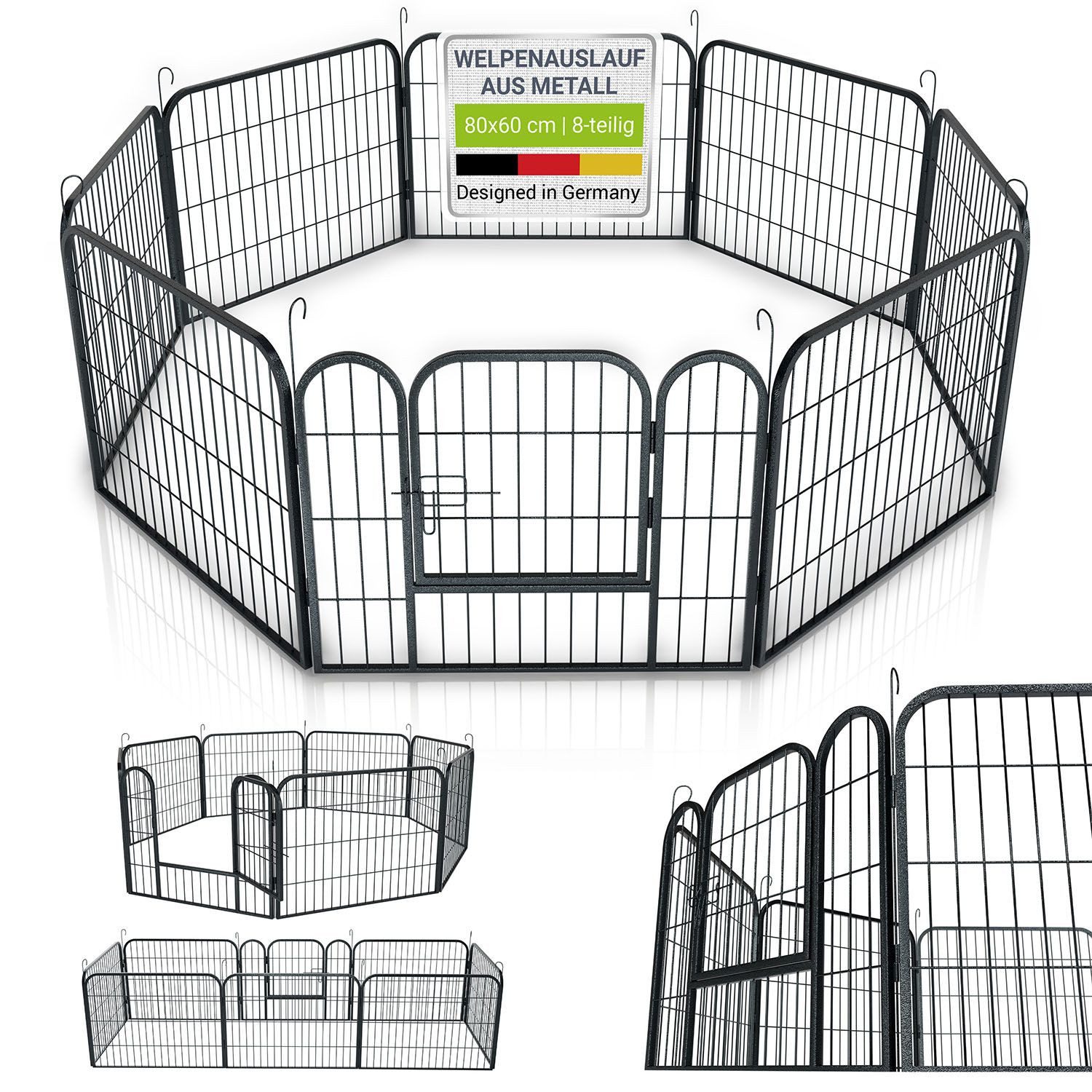Der Welpenlaufstall aus Stahl besteht aus 7 Seiten- und 1 Türelement. Zur Verbindung dienen Ankerhaken – d. h. ganz ohne Werkzeug! Der lackierte Stahl weist eine hohe Beständigkeit gegenüber Rost, Witterung und UV-Strahlung auf. Er lässt sich leicht mit feuchtem Tuch und milder Seifenlauge reinigen.