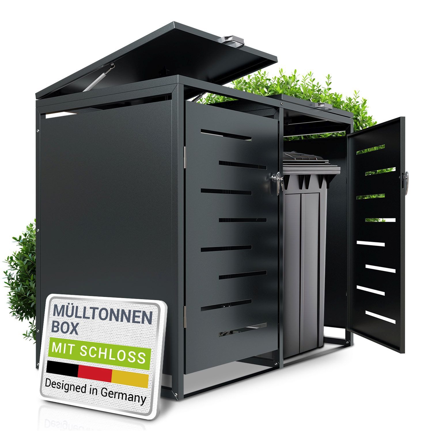 Die moderne 2er Metall Mülltonnenbox Arel mit Dach ist der ideale Wind-, Wetter- und Sichtschutz für Ihre Mülltonne Mülltonnen. Der Innenraum bietet Platz für zwei 120 bzw. 240 Liter Tonnen, die Sie in der Doppelbox elegant verbergen.Die Mülltonnenverkleidung für draußen hält Restmüll, Biotonne oder andere Abfallbehälter außer Sicht und dank der verschließbaren Türen per Schloss auch außer Reichweite von unbefugten Personen. Sie ist jedem Wetter gewachsen und einfach zu reinigen. Mit derdezenten Müllbox sorgen Sie für eine optische Aufwertung in Ihrem Vorgarten.