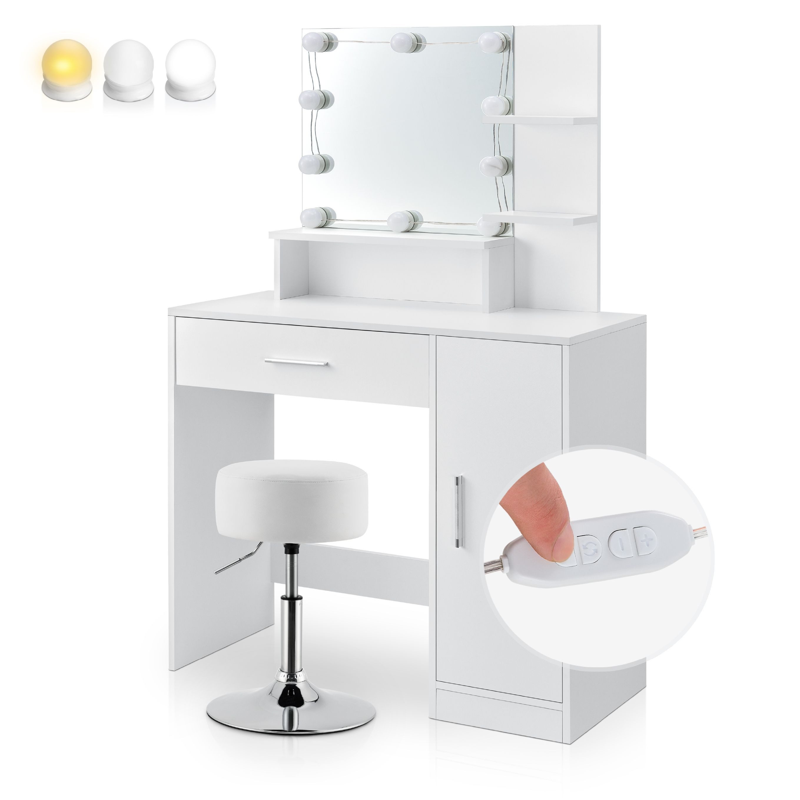 Die solide Verarbeitung bietet eine hohe Stabilität und Langlebigkeit. Der Schminktisch mit Hocker ist aus weißen Holzplatten gefertigt. Durch die Beschichtung lassen sich die Oberflächen leicht reinigen. Auch der höhenverstellbare Schminktischhocker überzeugt.