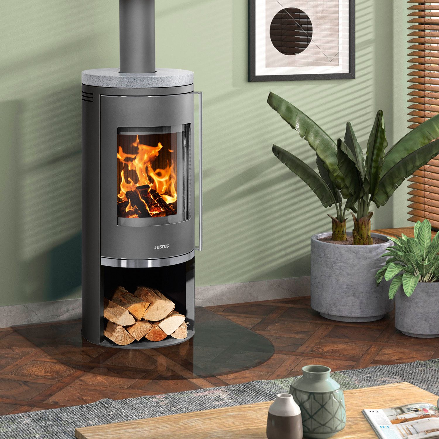 Ein Feuer sorgt für Wärme und Gemütlichkeit: mit dem runden Kaminofen »Faro 2.0« aus dem Haus JUSTUS mit einer Feuerraumauskleidung aus Vermiculite und einem nützlichen Holzfach easy machbar.