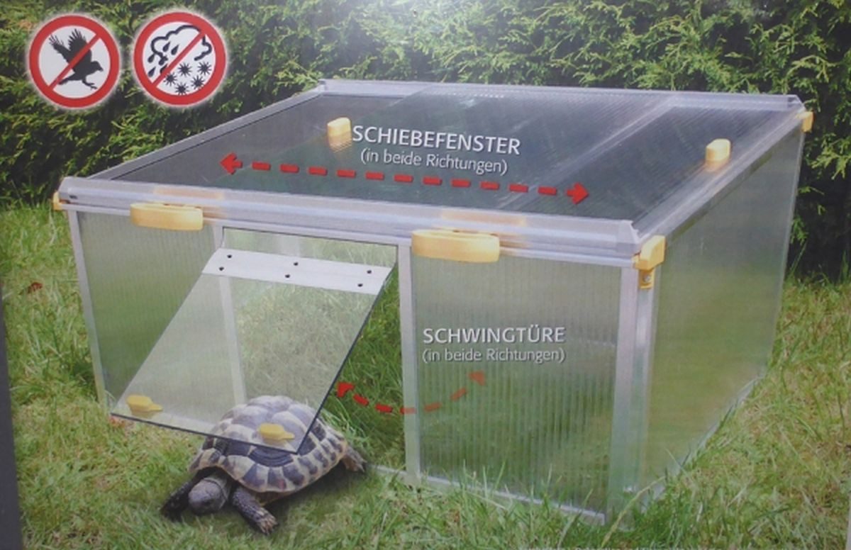 Aus hochtransparenten 8 mm starken UV stabilen Hohlkammerplatten mit höchster Wärmeisolierung und stabilen sowie korrosionsbeständigen Aluminiumprofilen rasch aufgebaut, ist das Schildkrötenheim mit einem Fenster mit Dual Funktion einzigartig: