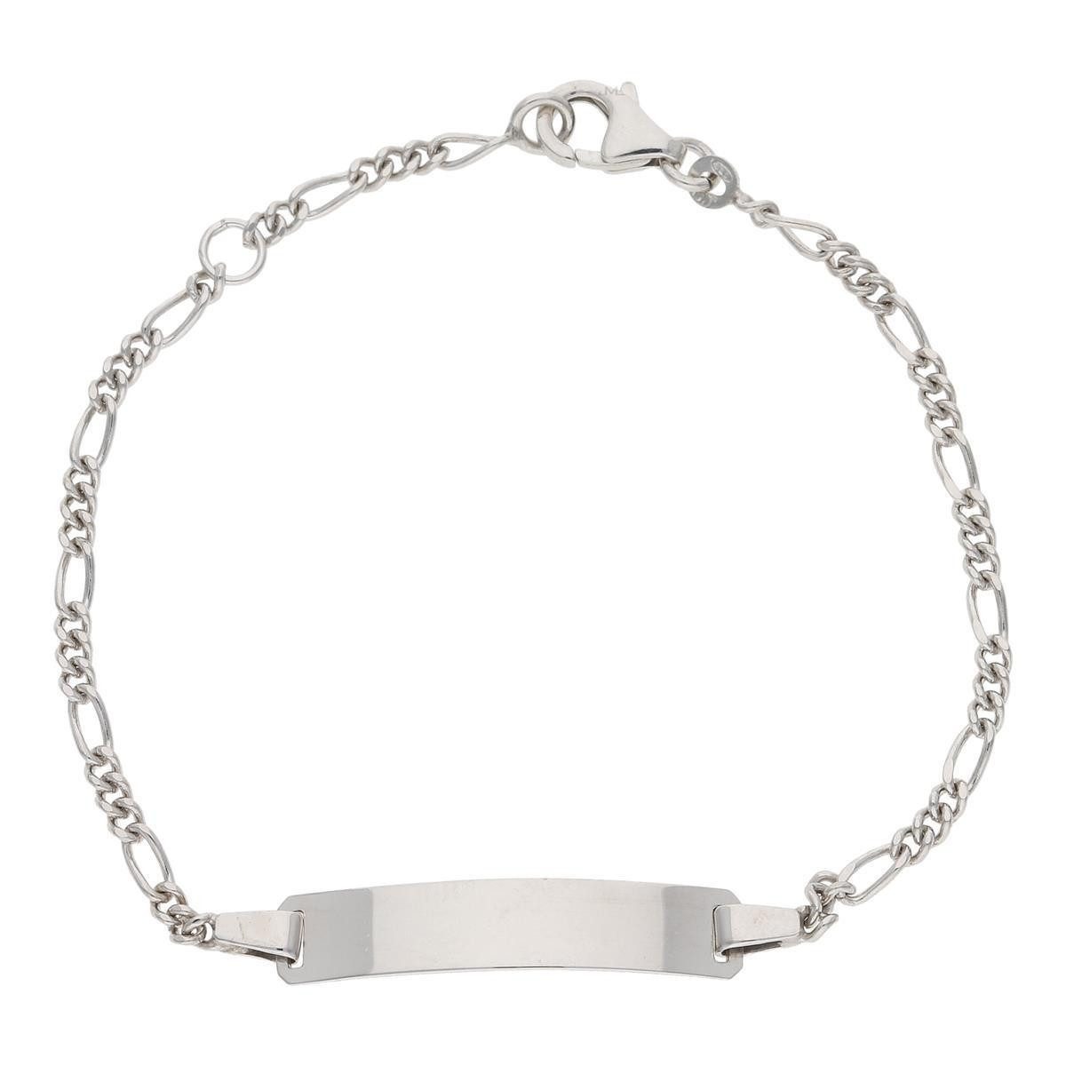 Zeitloses JuwelmaLux Kinder Identitäts-Armband in Sterling Silber 925/000. Das Identitätsarmband besteht aus einer Figaro Kette mit Gravurplatte. Verschlossen wird das Armband mit einem Karabiner. Durch eine zweite Öse kann das Armband in zwei verschiedenen Длинаn verschlossen werden. Все Ösen sind verlötet, für einen sicheren Halt. Das ideale Geschenk für Babys, Neugeborene. und Kinder