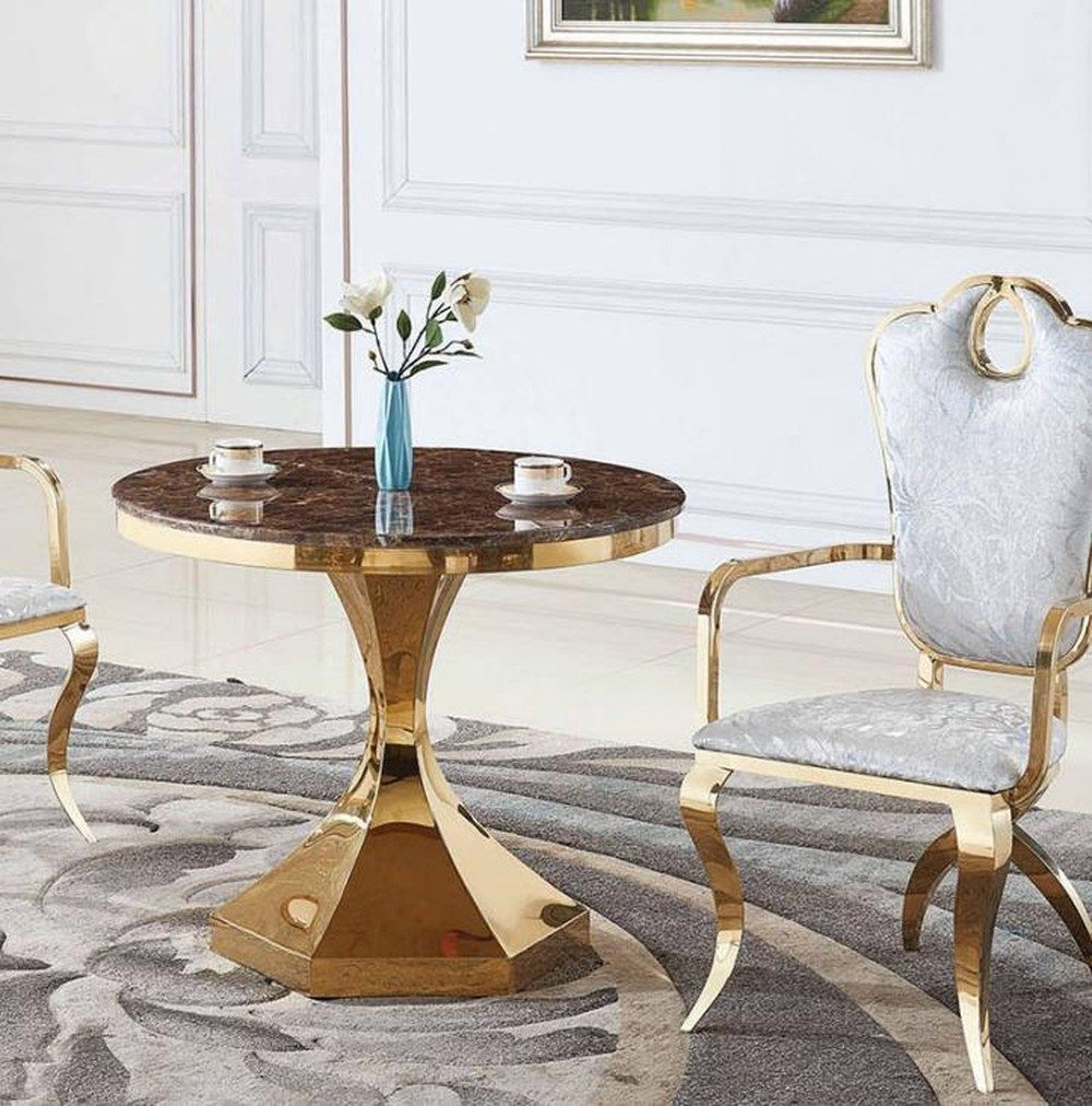 Entdecken Sie den luxuriösen Esstisch aus Holz und Edelstahl, der modernes Wohnen neu definiert. Mit seinem stilvollen Art Deco Design wird dieser Tisch zum Herzstück Ihres Ess- oder Wohnzimmers. Die goldfarbenen Edelstahlfüße verleihen nicht nur Stabilität, sondern auch einen Hauch von Eleganz, der Ihre Gäste beeindrucken wird. Die runde Form des Tisches (ca. 90 x 90 cm) schafft eine einladende Atmosphäre für gesellige Runden und festliche Anlässe. Die hochwertige Verarbeitung und das edle Material spiegeln unsere Philosophie wider, höchste Ästhetik mit funktionalem Design zu vereinen. Dank seiner pflegeleichten Oberfläche kann der Tisch mühelos mit einem feuchten Tuch gereinigt werden und bleibt so stets ein Traumstück in Ihrem Zuhause. Ob für den täglichen Gebrauch oder besondere Anlässe – dieser Esstisch ist multifunktional und passt ideal in moderne Wohnstile. Investieren Sie in Qualität, die in Europa gefertigt wird, und bringen Sie einen Hauch von Luxus in Ihre vier Wände. Dieser Esstisch ist die perfekte Wahl für Erwachsene und Jugendliche, die Stil und Funktionalität schätzen.