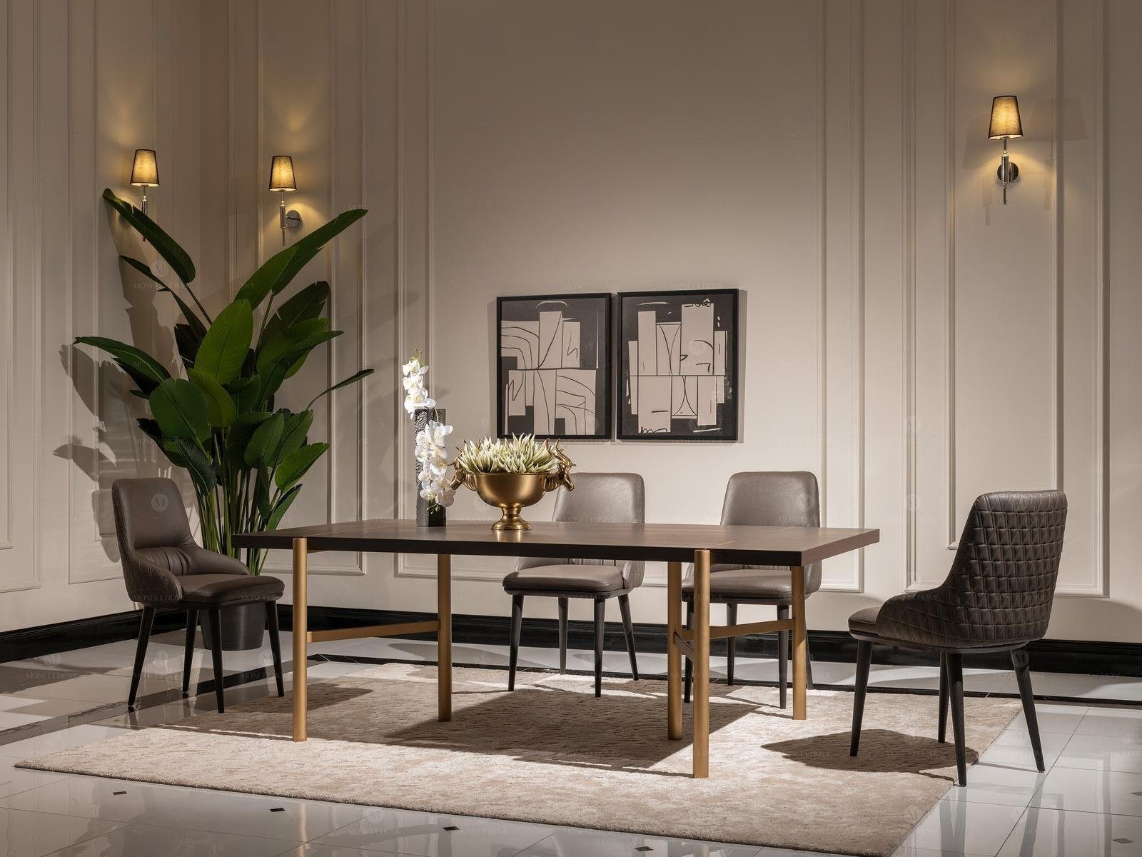 Präsentieren Sie Ihren Essbereich mit unserem modernen Esstisch aus hochwertigem Holz in elegantem Braun, veredelt durch ansprechende goldene Akzente. Mit großzügigen Maßen von ca. 220 x 103 x 76 cm bietet dieser Tisch nicht nur ausreichend Platz für gesellige Runden, sondern setzt auch ein statement in jedem Zuhause. Die runden Füße sorgen nicht nur für Stabilität, sondern auch für eine harmonische Linienführung, die jedem Raum eine stilvolle Note verleiht. Hergestellt in Europa, steht dieser Esstisch für Qualität und Langlebigkeit. Der natürliche Holzbezug bringt Wärme und Gemütlichkeit in Ihr Esszimmer, während die goldenen Details einen Hauch von Luxus hinzufügen. Ideal für Erwachsene und Jugendliche, die Wert auf modernes Design legen. Außerdem sorgt der einfache Aufbau mit enthaltenem Montagematerial für eine mühelose Montage. Verleihen Sie Ihrem Zuhause einen zeitgemäßen Touch mit diesem außergewöhnlichen Stück, das sowohl funktional als auch ästhetisch überzeugt. Erleben Sie ein neues Level des Essens in einer stilvollen Atmosphäre.