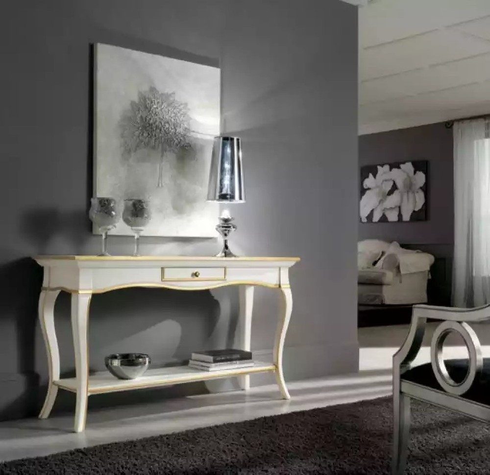 Entdecken Sie die Elegante weiße Holz-Konsole im modernen Luxus-Stil – das perfekte Möbelstück für Ihr Zuhause. Mit ihren klaren Linien und der strahlend weißen Oberfläche verkörpert dieser Konsolentisch den zeitlosen Art déco-Stil und verleiht jedem Raum eine edle Note. Gefertigt aus hochwertigem Holz, bietet die Konsole nicht nur ein elegantes Design, sondern auch multifunktionalen Stauraum mit einem praktischen Einlegeboden und einer Schublade. Ob im Wohnzimmer, Flur oder Arbeitszimmer, dieser Tisch harmoniert perfekt mit verschiedenen Einrichtungsstilen und schafft Ordnung ohne Kompromisse beim Design einzugehen. Die Maße von ca. 135 x 47 x 80 cm machen ihn ideal für schmale Räume und bieten gleichzeitig ausreichend Fläche für Dekorationen oder Ihre Lieblingsstücke. Hergestellt in Europa, steht dieser Konsolentisch für erstklassige Verarbeitung und nachhaltige Qualität. Bringen Sie mit der eleganten Konsole modernen Luxus in Ihr Zuhause und erleben Sie die perfekte Kombination aus Funktionalität und Stil.