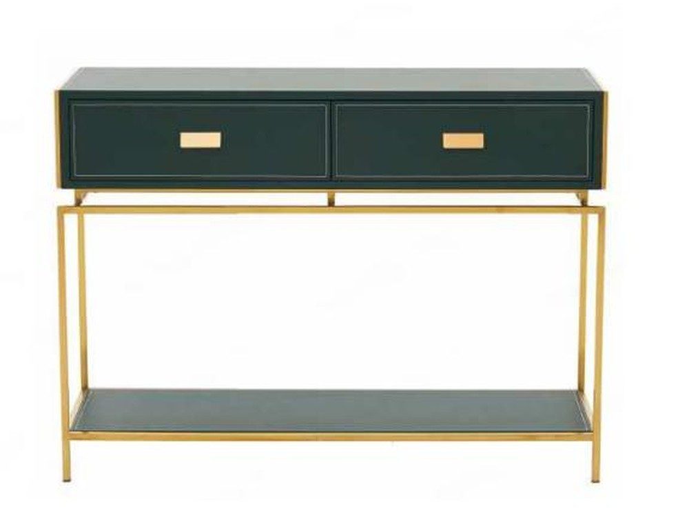 Entdecken Sie den eleganten grünen Konsolentisch aus Holz und Edelstahl, der Ihrem Wohnzimmer eine frische und moderne Note verleiht. Mit seinen stattlichen Maßen von 120 x 40 x 80 cm bietet dieser Tisch nicht nur einen stilvollen Blickfang, sondern auch praktischen Stauraum durch zwei geräumige Schubladen. Die exquisite Kombination aus hochwertigem Holz und edlen Edelstahl-Elementen sorgt für Langlebigkeit und ist gleichzeitig eine Hommage an modernes Design. Die vierkantigen Füße in elegantem Gold verstärken die außergewöhnliche Ästhetik und verleihen dem Tisch Stabilität und Stil. Hergestellt in Europa, steht dieser Konsolentisch für beste Qualität und Handwerkskunst. Die schlichte, aber ansprechende grüne Farbe fügt sich harmonisch in jede Wohnlandschaft ein und wird zum Highlight in Ihrem Raum. Ob im Flur, Wohnzimmer oder als praktischer Ablageort – dieser Konsolentisch passt sich Ihrem Leben an. Entdecken Sie die Möglichkeit, Stil und Funktionalität zu vereinen – perfekt für Erwachsene und Jugendliche, die das Besondere schätzen. Montagematerial ist im Lieferumfang enthalten, sodass Sie im Handumdrehen Freude an Ihrem neuen Möbelstück haben.