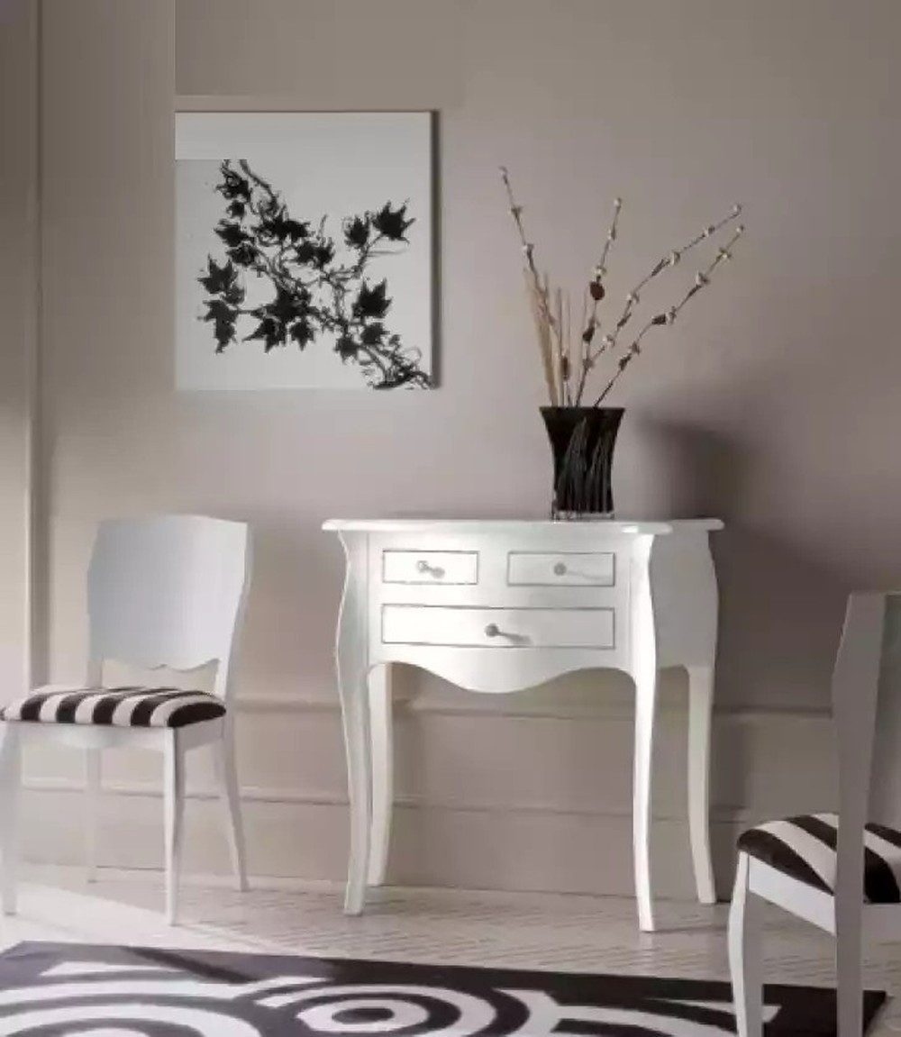 Entdecken Sie das italienische Design Sideboard aus weißem Holz, ein perfektes Stück für Ihr Zuhause im Luxusstil. Dieses exquisite Konsolentisch vereint klassische Eleganz mit modernen Akzenten und bringt zeitlose Schönheit in Ihr Wohnzimmer. Gefertigt in Europa, spiegelt dieses Möbelstück die Tradition und die hohen Qualitätsstandards handwerklicher Möbelhersteller der Region Marken wider. Mit Abmessungen von 90 x 40 x 85 cm bietet das Sideboard nicht nur einen stilvollen Blickfang, sondern auch praktischen Stauraum in Form von drei geräumigen Schubladen, die Ihre Wohnräume stets aufgeräumt halten. Das schlichte, rechteckige Design im Art-déco-Stil und die schneeweiße Farbe verleihen jedem Raum eine Luft von Exklusivität und Raffinesse. Ideal für Erwachsene und Jugendliche, fügt es sich nahtlos in verschiedene Wohnstile ein. Verwöhnen Sie sich selbst mit diesem multifunktionalen Möbelstück, das sowohl Ästhetik als auch Funktionalität vereint. Lassen Sie Ihr Zuhause im Glanz italienischen Designs erstrahlen.