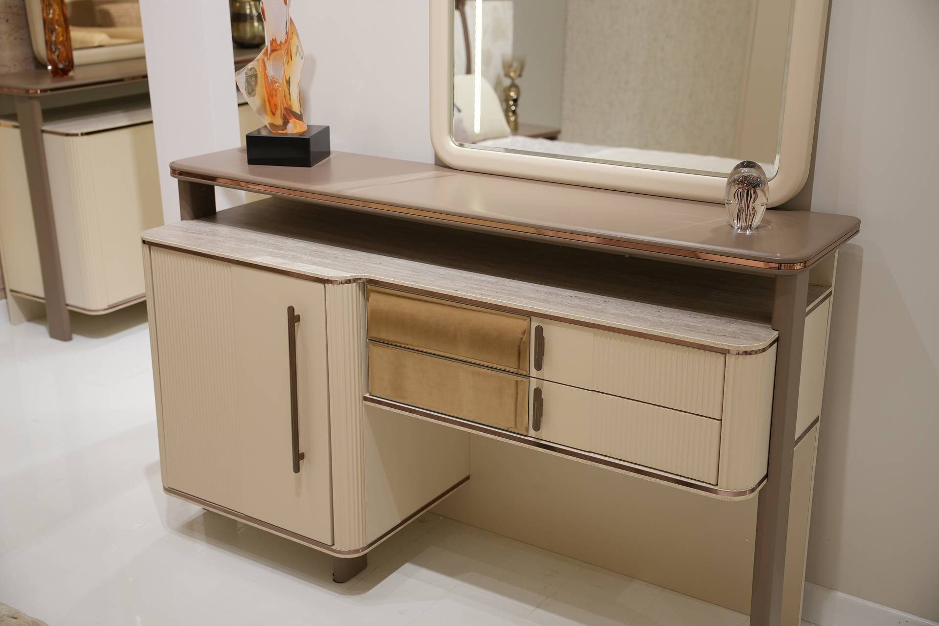 Dieser elegante beigerfarbene Schminktisch aus hochwertigem Holz vereint stilvolles Design und praktische Funktionalität. Mit seiner sanften Farbgebung fügt er sich harmonisch in jedes Schlafzimmer oder Ankleidezimmer ein und schafft eine gemütliche Atmosphäre. Der großzügige Spiegel sorgt für optimale Lichtverhältnisse und ermöglicht ein perfektes Make-up. Die sorgfältige Verarbeitung und die robusten Materialien garantieren Langlebigkeit, während die schlichten Linien und das zeitlose Design dieses Möbelstück zu einem absoluten Blickfang machen. Ideal für alle, die Wert auf Ästhetik und Komfort legen.