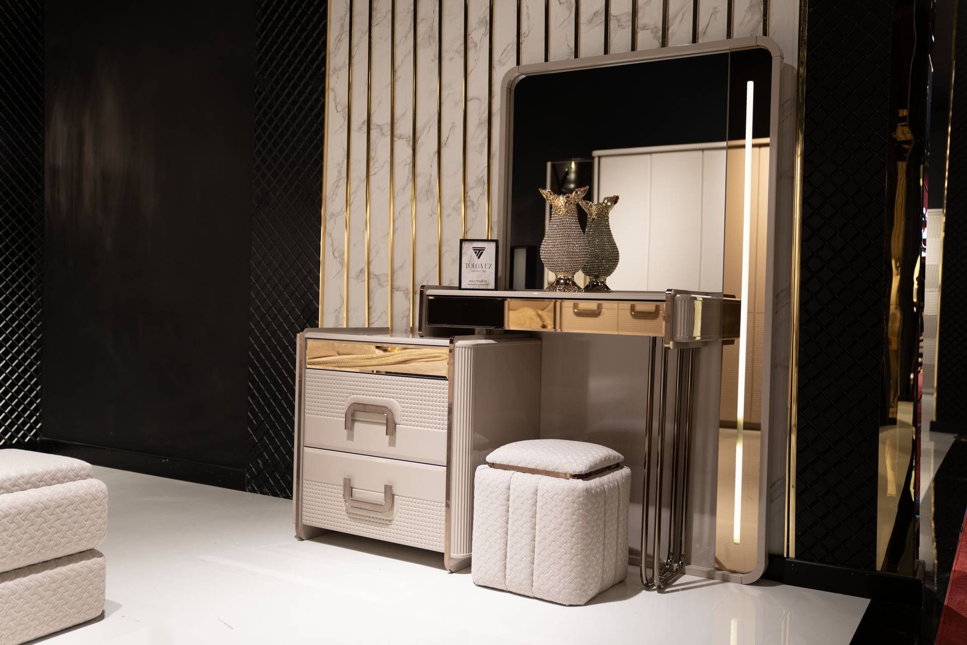 Der moderne beiger Schminktisch mit Spiegel und Sitzpuff aus Holz ist die perfekte Ergänzung für jedes Schlafzimmer oder Ankleidezimmer. Sein elegantes Design vereint Funktionalität und Stil, während die sanfte beige Farbe eine warme und einladende Atmosphäre schafft. Der großzügige Spiegel sorgt für optimale Beleuchtung und Sicht, während der komfortable Sitzpuff zusätzlichen Komfort bietet. Aus hochwertigem Holz gefertigt, ist dieser Schminktisch nicht nur ästhetisch ansprechend, sondern auch langlebig und robust, ideal für die tägliche Nutzung. Verleihen Sie Ihrem Raum mit diesem stilvollen Möbelstück einen Hauch von Eleganz und Raffinesse.