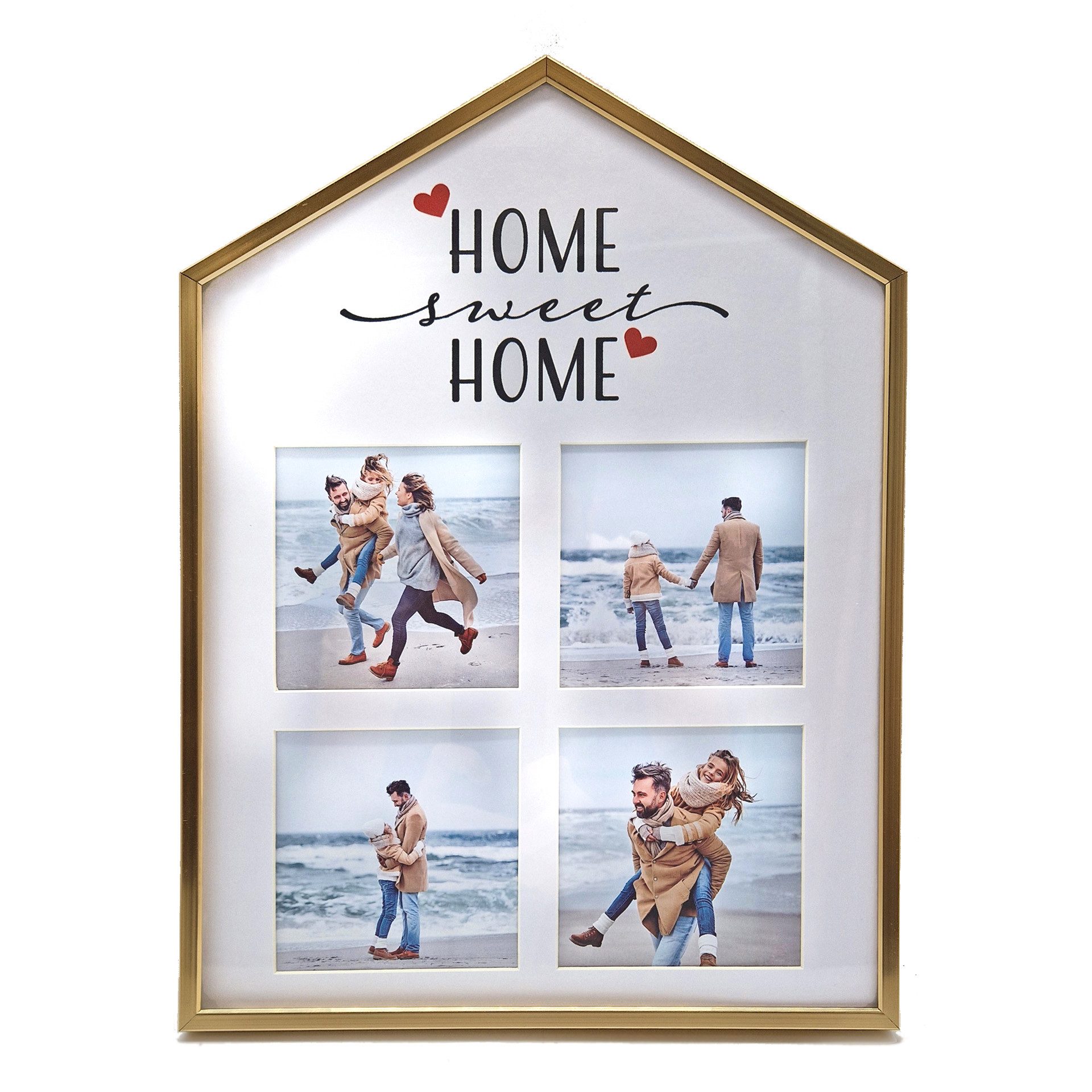 "Home sweet Home" Fotorahmen für wertvolle Erinnerungen Mit der Bilderrahmen-Collage können mehrere Fotos gleichzeitig eingerahmt und an die Wand gebracht werden. Der hochwertige Kontrastrahmen aus Aluminium setzt Familienfotos, Notizen, Postkarten und Zeichnungen optimal in Szene. Unvergessliche Aufnahmen und glückliche Affirmationen aus Reisen, Hochzeit und Geburtstag sorgen als Wanddekoration für ein gemütliches Ambiente und setzen liebevolle Akzente im Wohnraum. Kreieren Sie aus Ihren Lieblingsmomenten und Lieblingsmenschen ein einzigartiges Kunstwerk in Wohnzimmer, Büro und Schlafzimmer. Auch im Kinderzimmer eignet sich die Passepartout Bildercollage als aufregendes Wandbild. Die integrierte und vormontierte Wandhalterung erleichtert das Anbringen an der Wand. Größe Goldener Aluminium Fotorahmen 25.4 x 34.3 cm. Platz für 4 Fotos 10 x 10 cm Holzoptik Aluminium Fotorahmen 25.4 x 34.3 cm. Platz für 4 Fotos 10 x 10 cm