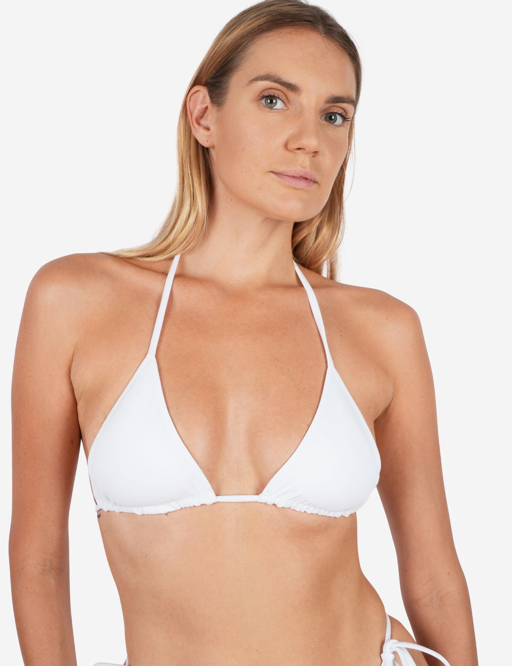 Dieses Triangel-Bikini-Top hat herausnehmbare Cups und lässt sich durch Bänder zum Schnüren im Nacken und Rücken individuell anpassen. Goldfarbene Stopper an den Enden der Bänder setzen dabei elegante Akzente. Gefertigt aus recycelten Materialien wie alten Fischernetzen und Teppichresten, entsteht das Top unter fairen Bedingungen auf Bali. Der Stoff ist schnelltrocknend, formbeständig und fühlt sich an wie eine zweite Haut.