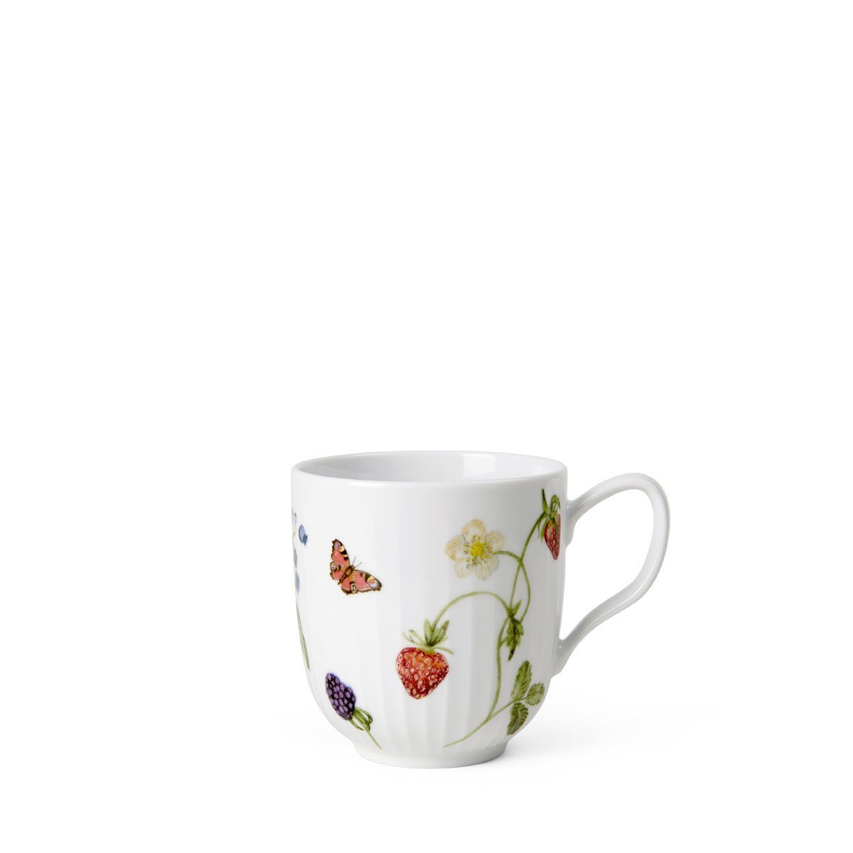 Kähler Design - Hammershøi Summer Becher 33 cl, summer berries Hammershøi Summer ist die Essenz des Sommers in voller Blüte, verewigt auf ausgewählten Teilen der beliebten Hammershøi-Serie von Kähler. Decken Sie die Kaffeetafel mit diesen Bechern, um eine fröhliche, gemütliche Sommeratmosphäre zu schaffen, und genießen Sie etwas Leckeres im Garten, auf der Terrasse, auf dem Balkon oder im Ferienhaus. Der Becher fasst 33 cl und ist mit sommerlich süßen Beeren und einem verspielten, poetischen Schmetterling verziert. Die diskreten Rillen der Serie verleihen dem Becher seinen eleganten und klassischen Look. Die Illustrationen fügen einen sommerlichen Touch hinzu. Wenn man sich Hammershøi Summer ansieht, spürt man schon beinahe Sonnenstrahlen und eine warme Sommerbrise auf der Haut. Und Rikke Jacobsen, die Schöpferin der Aquarelldekorationen, ließ sich tatsächlich von den magischen Formen, Farben und Gefühlen des dänischen Sommers inspirieren.