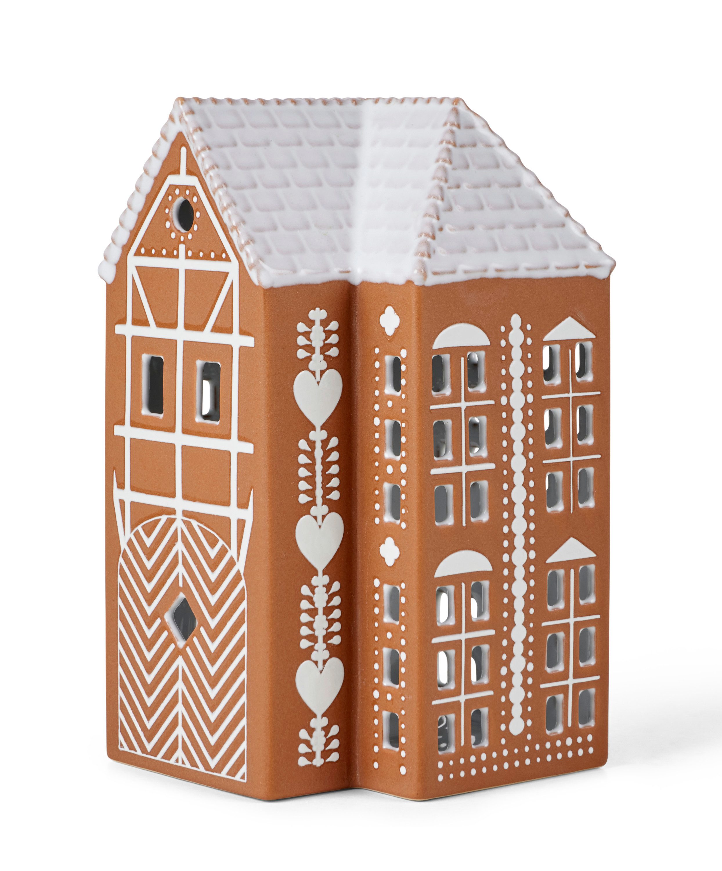 Dieses Lichthaus besticht durch seine liebevoll gestalteten Details. Die Vorderseite ist mit einem filigranen Fachwerkmuster, einem kunstvollen Rundfenster und einem großen Tor versehen, das zum Eintreten einlädt. Große weiße Herzen zieren die Seiten des Hauses und symbolisieren Nächstenliebe und Zusammenhalt – Werte, die in der Weihnachtszeit eine besondere Bedeutung haben. Jedes Kähler Gingerbread Lichthaus wird in Handarbeit gefertigt, was jedes Exemplar einzigartig macht. Die Dächer sind mit weißen Verzierungen versehen, die wie Zuckerguss wirken, und verleihen dem Design seinen festlichen Charme.