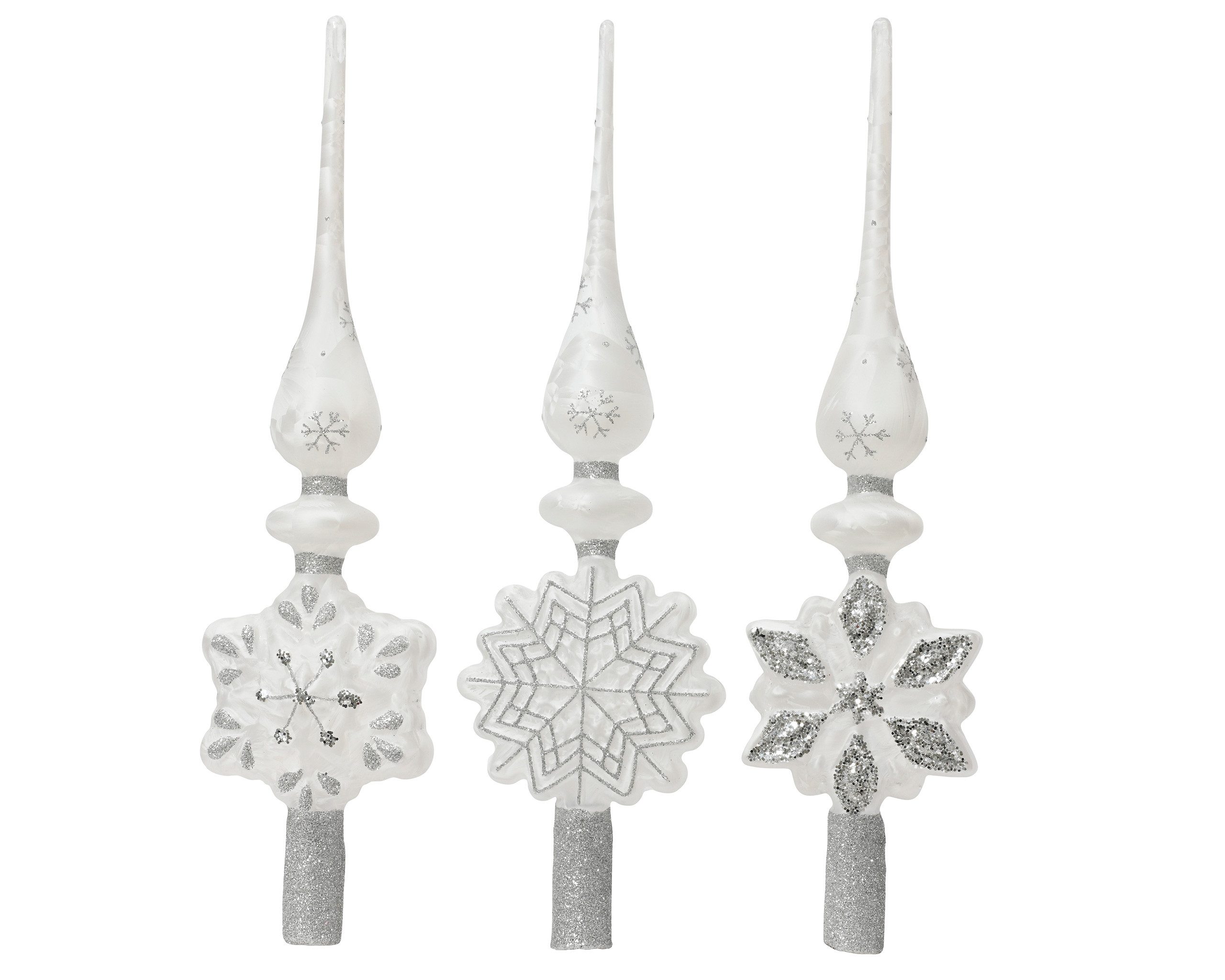 PRODUKT: Weihnachtsspitze / HÖHE: ca. 35 cm / DURCHMESSER: ca. 10 cm / MATERIAL: Glas / INHALT: 1 Spitze (Auslieferung nach Zufallsprinzip) / FARBE: weiß - winterweiß