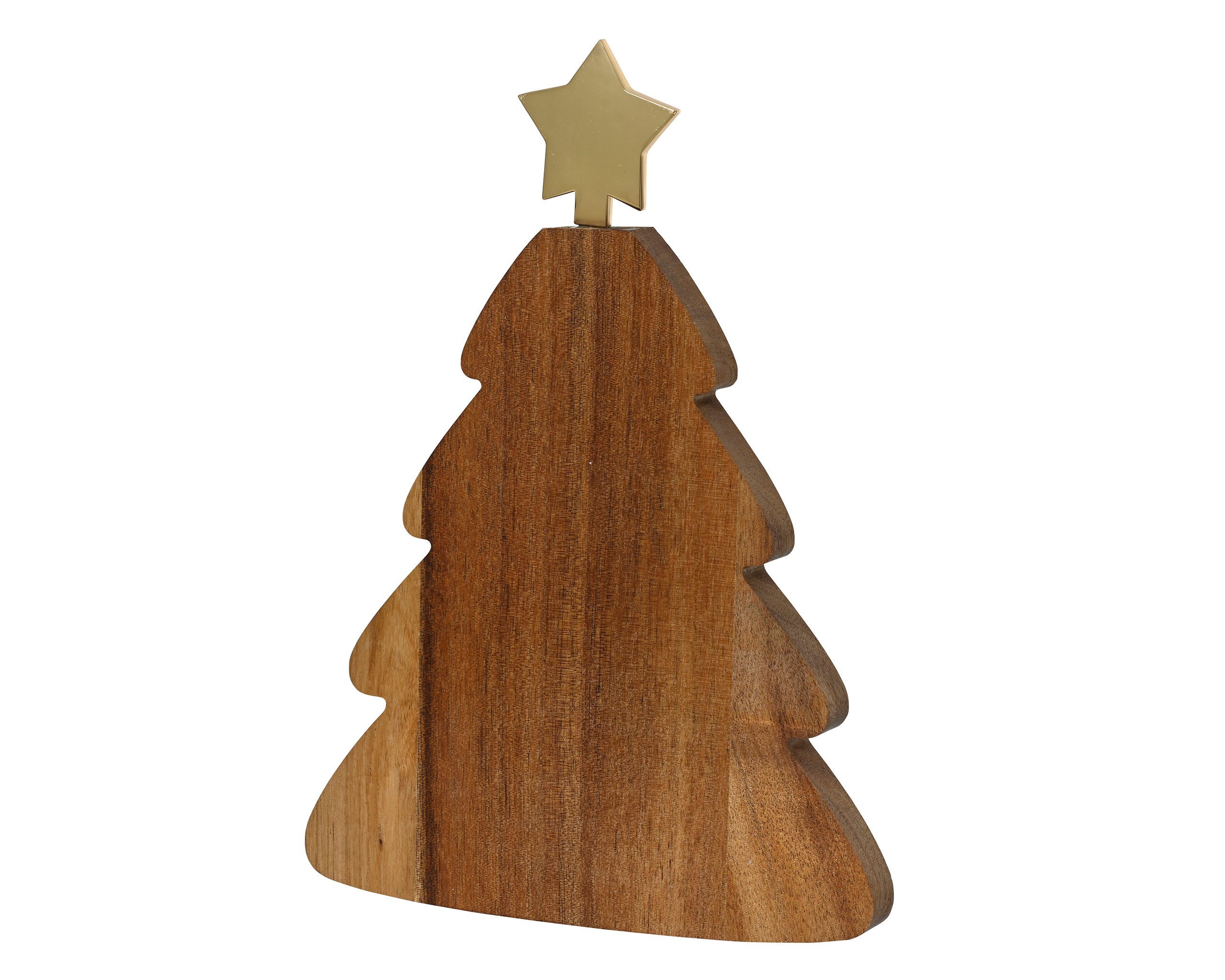 Holzschneidebrett & Messer / Dekoratives Küchenbrett Material: Holz - Akazienholz, Metall - Edelstahl Размер (LxBxH) ca. 24 x 17 x 1,5 cm Packungsinhalt: 1 Brett und 1 Messer Farbe: naturfarben - naturbraun - natur braun - gold - 2-teiliges Set, lebensmittelecht - Holzbrett in Weihnachtsbaumform mit integriertem Messer mit Messergriff in Sternform Dieses weihnachtliche, baumförmige Holzbrett ist funktional, dekorativ und eine gute Wahl zum Verschenken. Das originelle Schneidebrett in Baumform überrascht mit einem besonderen Detail: Ein passendes Messer mit goldenem Stern als Griff lässt sich im oberen Teil des Bretts integrieren, so wird aus dem Küchenhelfer eine Weihnachtsdekoration. Das Schneidbrett ist eine Schneideunterlage, aber auch ideal zum Servieren von Käse, Snacks und Häppchen. Es ist lebensmittelecht und sicher für die Zubereitung Ihrer Mahlzeiten. Das Schneideholzbrett mit Brotzeitmesser Geschenkset ist auch eine gute Geschenkidee. Überraschen Sie Ihre Familie, Freunde oder Kollegen mit diesem Servierset als Weihnachtsgeschenk oder Wichtelgeschenk. Figur & Thema & Motto: Weihnachtsbaum, Christbaum, Tannenbaum, Tanne, Nadelbaum, Baum, Form, Wald & Bäume, Stern, Sternchen, Weihnachtsstern, sternförmig, 2 in 1, two in one Stil & Aufmachung: Moderner Landhausstil, Country, Natur, rustikal, außergewöhnlich, festlich