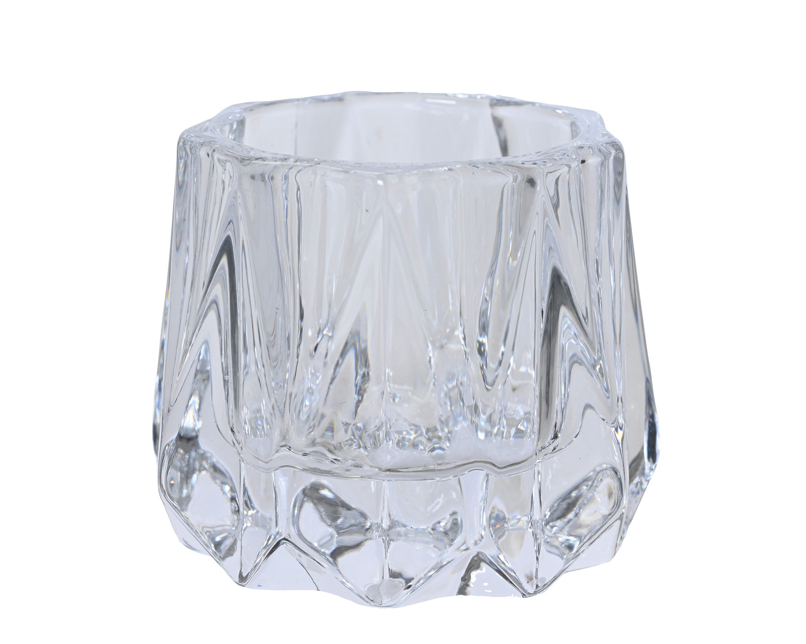 PRODUKT: gerilltes Kerzenglas / INHALT: 1 Teelichtglas / MATERIAL: Glas / GRÖSSE (DxH): ca. 6,4 x 5,5 cm / FARBEN: klar transparent