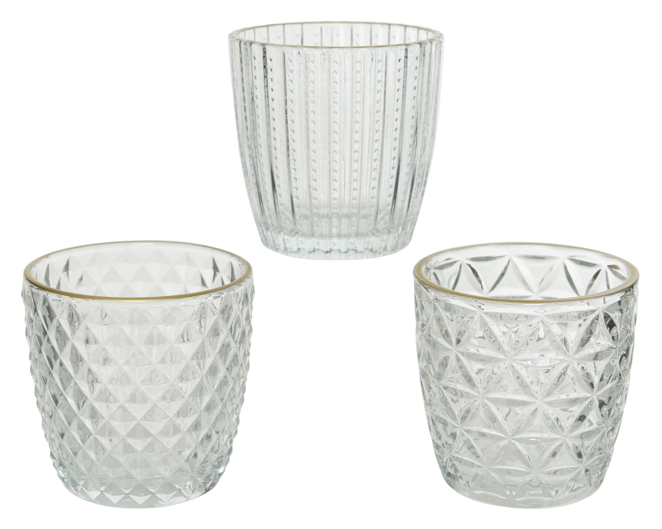 PRODUKT: Kerzenglas mit Reliefmuster / INHALT: 1 Teelichtglas (Auslieferung nach Zufallsprinzip) / MATERIAL: Glas / GRÖSSE (DxH): ca. 7,5 x 7,5 cm / FARBEN: klar transparent - gold