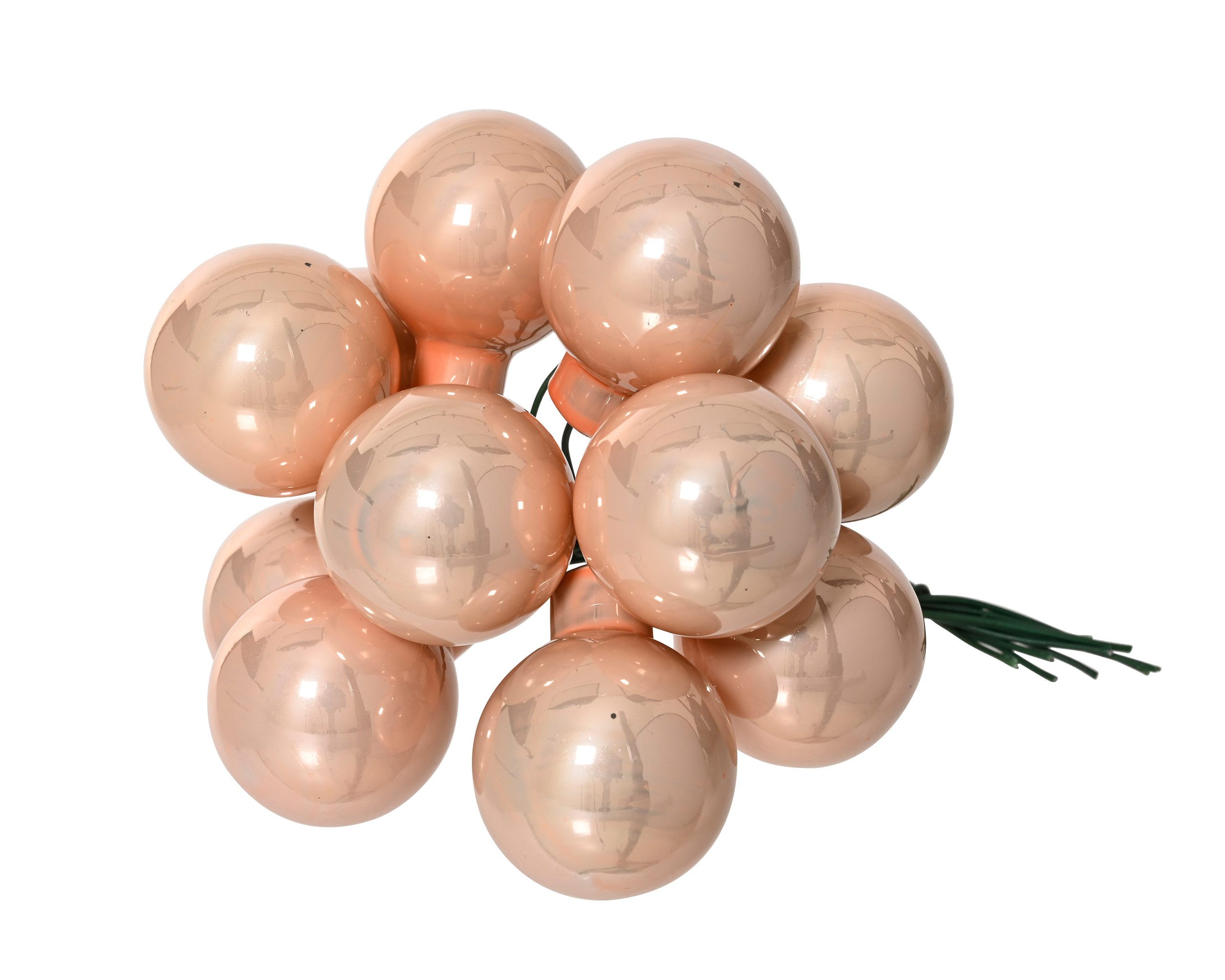 PRODUKT: Kleine Christbaumkugeln am Draht / DURCHMESSER: ca. 2 cm / MATERIAL: Glas / INHALT: 1 Bündel mit 12 Glaskugeln am Draht / FARBTON: champagner mit hellem Pfirsichton -