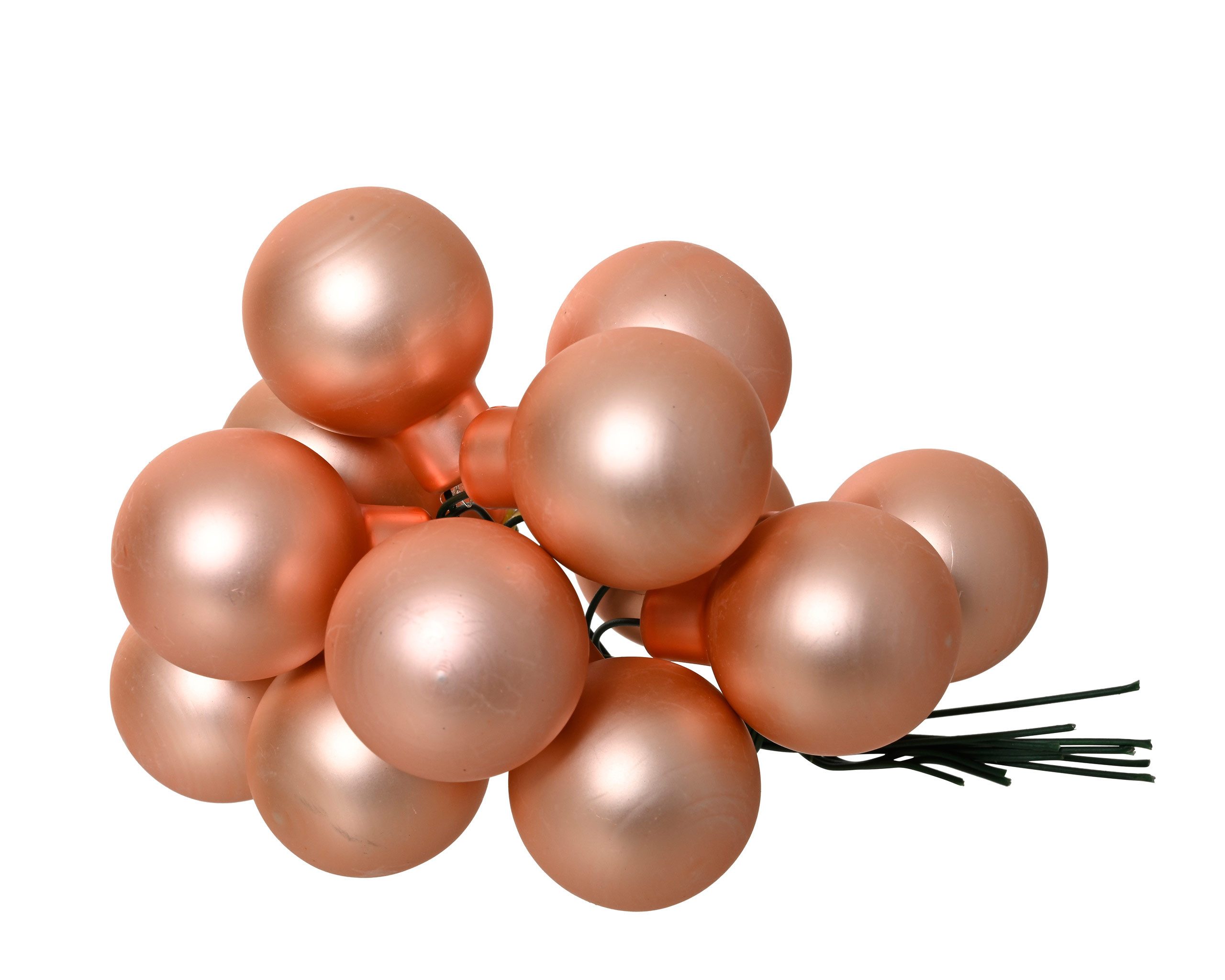 PRODUKT: Kleine Christbaumkugeln am Draht / DURCHMESSER: ca. 2 cm / MATERIAL: Glas / INHALT: 1 Bündel mit 12 Glaskugeln am Draht / FARBTON: champagner mit hellem Pfirsichton -
