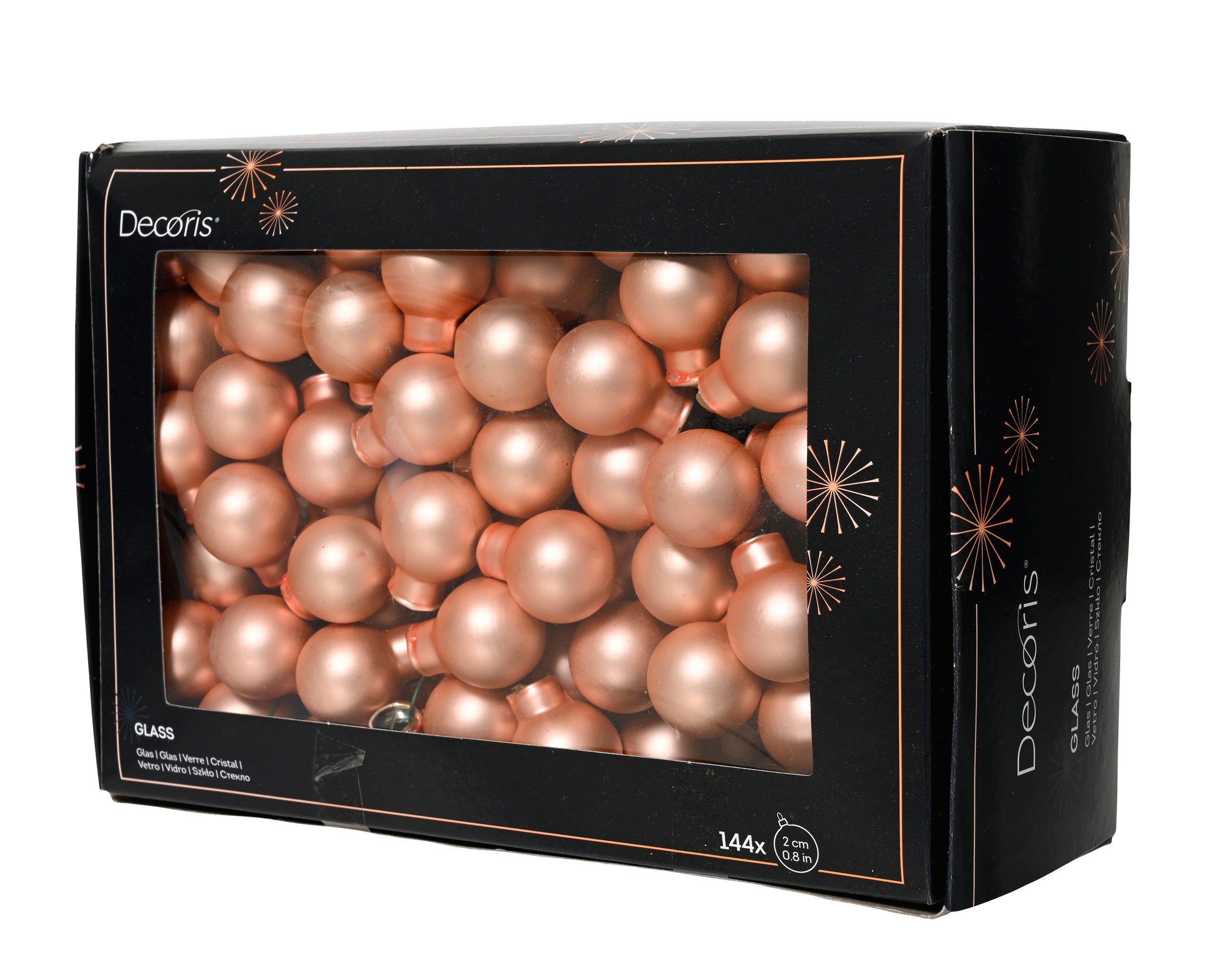 PRODUKT: Kleine Christbaumkugeln am Draht / DURCHMESSER: ca. 2 cm / MATERIAL: Glas / INHALT: 12 Bündel mit je 12 Glaskugeln am Draht / FARBTON: champagner mit hellem Pfirsichton -