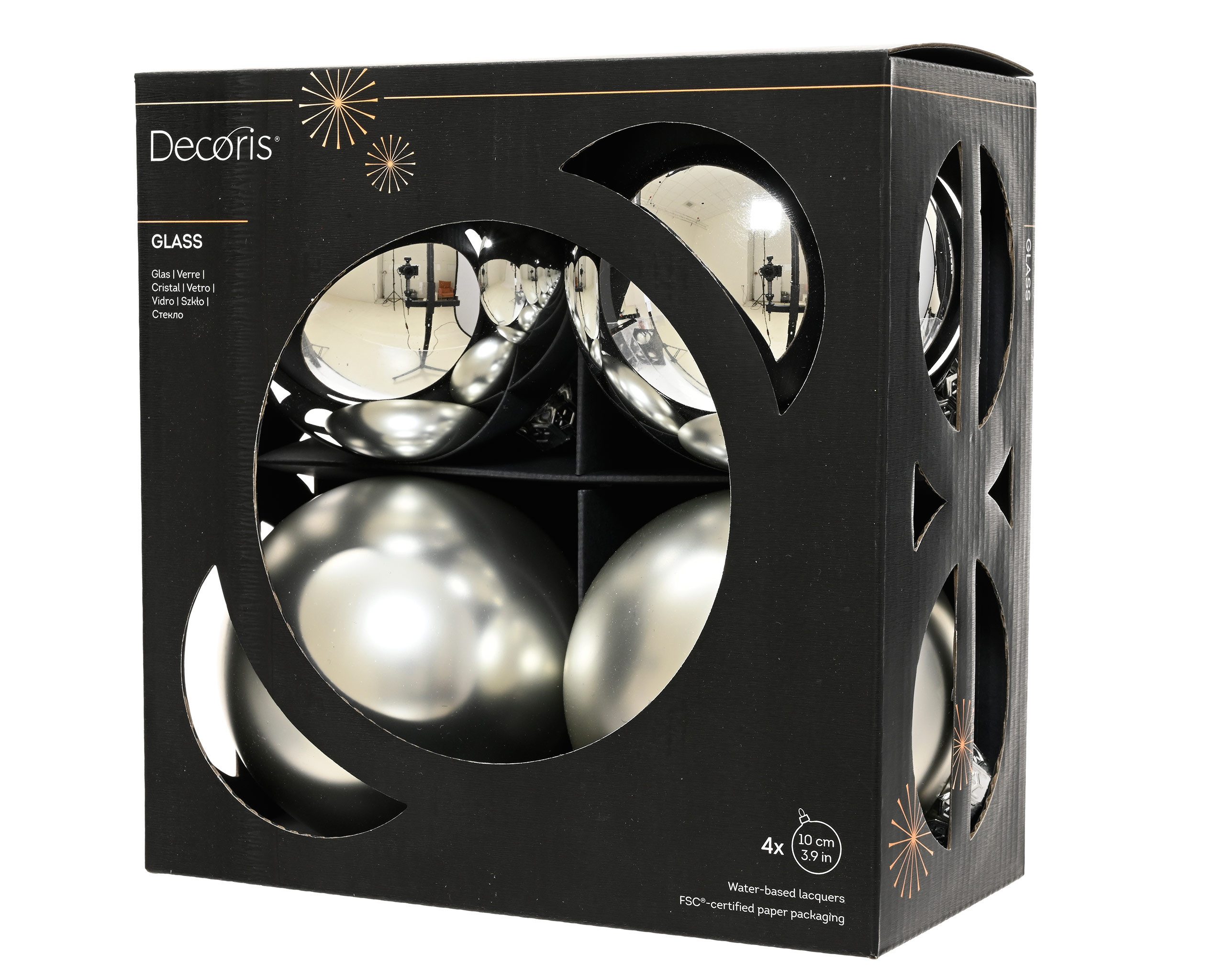 PRODUKT: Große Weihnachtskugeln / DURCHMESSER: ca. 10 cm / MATERIAL: Glas / INHALT: 4 Kugeln / FARBTON: silber