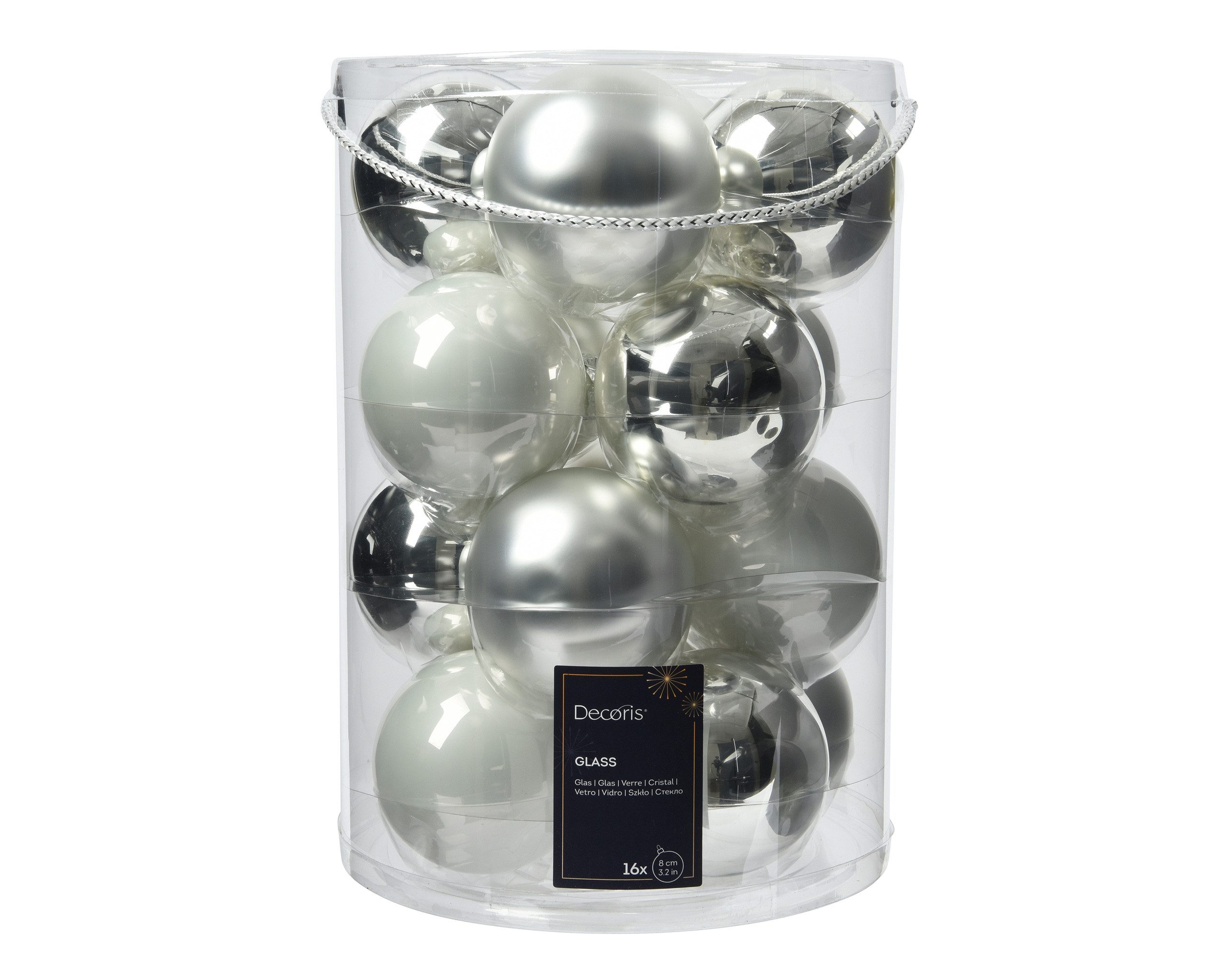 PRODUKT: Große Weihnachtskugeln / DURCHMESSER: ca. 8 cm / MATERIAL: Glas / Inhalt: 16 Kugeln / Farbe: Mix aus winterweiß - weiß und silber