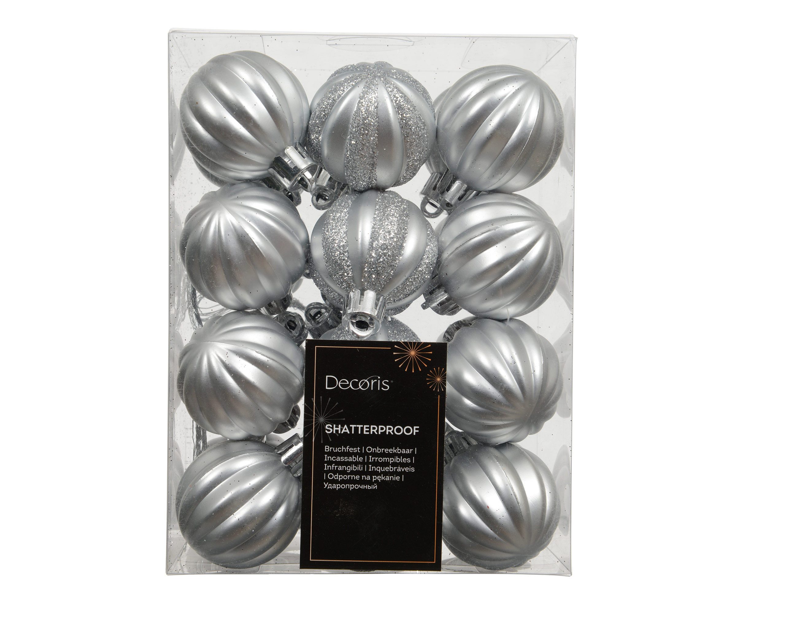 PRODUKT: Weihnachtskugeln mit Rillen / DURCHMESSER: ca. 4 cm / MATERIAL: Kunststoff - Plastik / Inhalt: 24 Kugeln / Farbton: silber