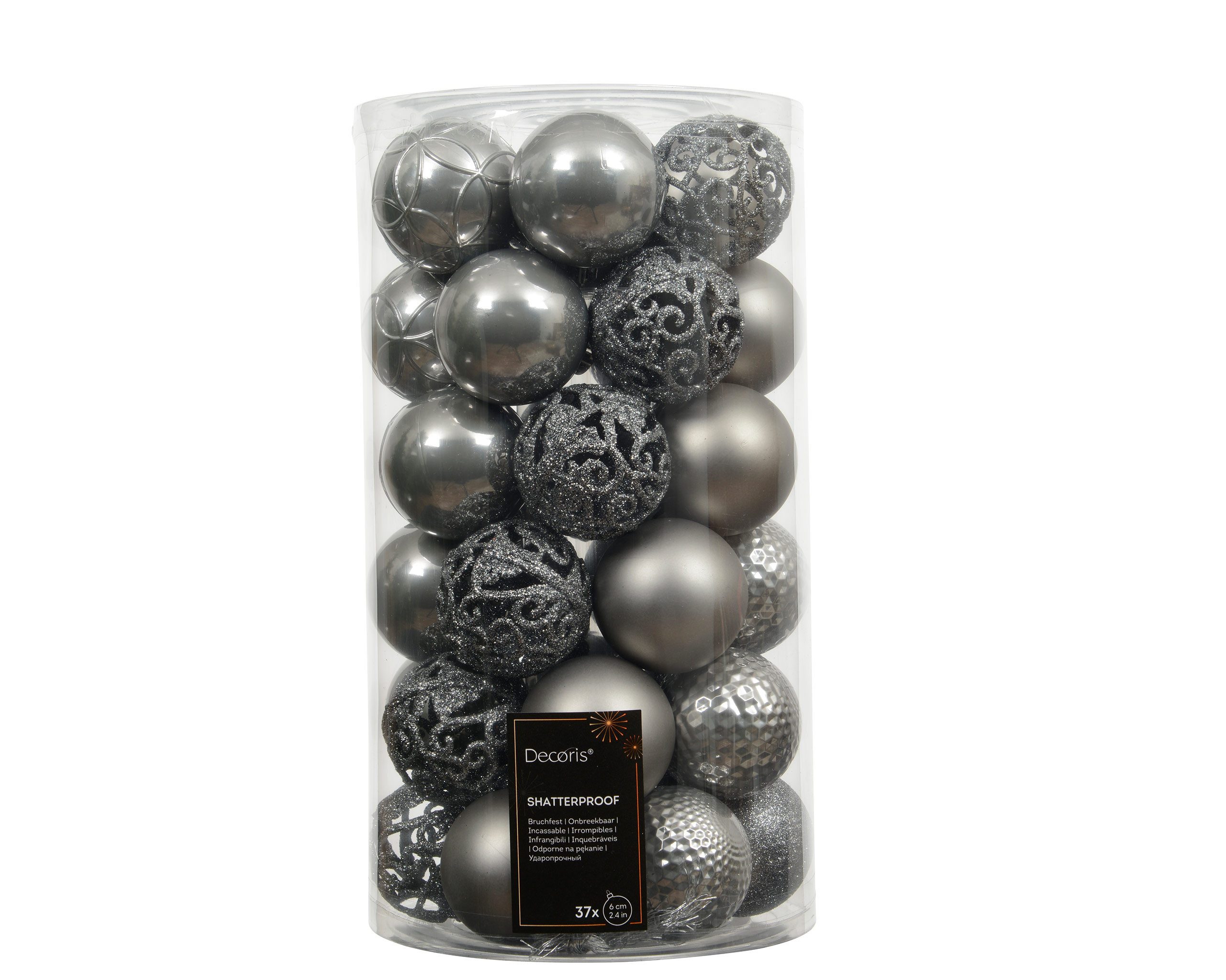 PRODUKT: Weihnachtskugeln mit Ornamenten – matt glänzend & glitzernd gemischt / DURCHMESSER: ca. 6 cm / MATERIAL: Kunststoff – Plastik / INHALT: 37 Kugeln / FARBTON: hellgrau -