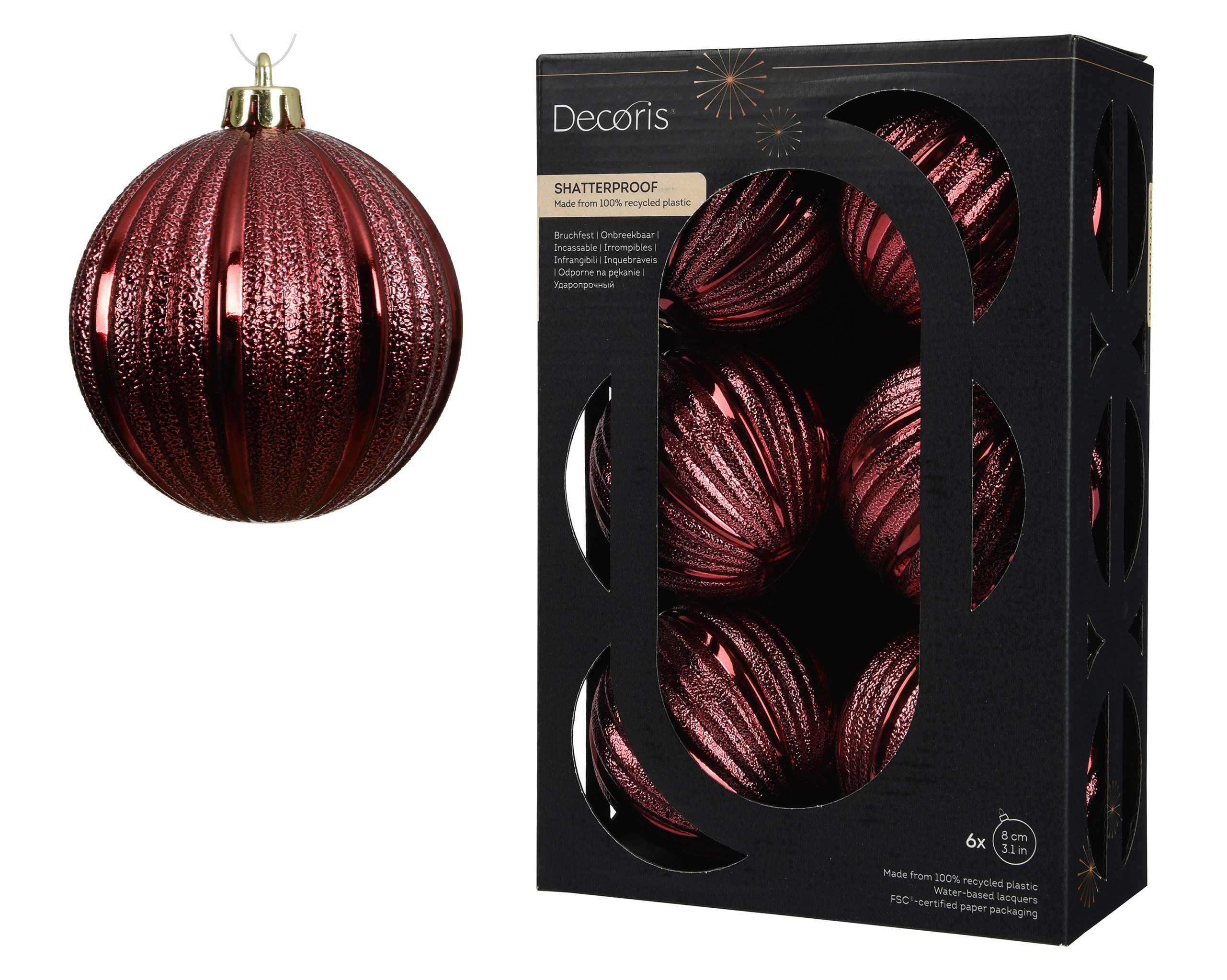PRODUKT: Weihnachtskugeln mit Rillen / DURCHMESSER: ca. 8 cm / MATERIAL: Kunststoff - Plastik / Inhalt: 6 Kugeln / Farbton: dunkelrot - weinrot - burgunderrot