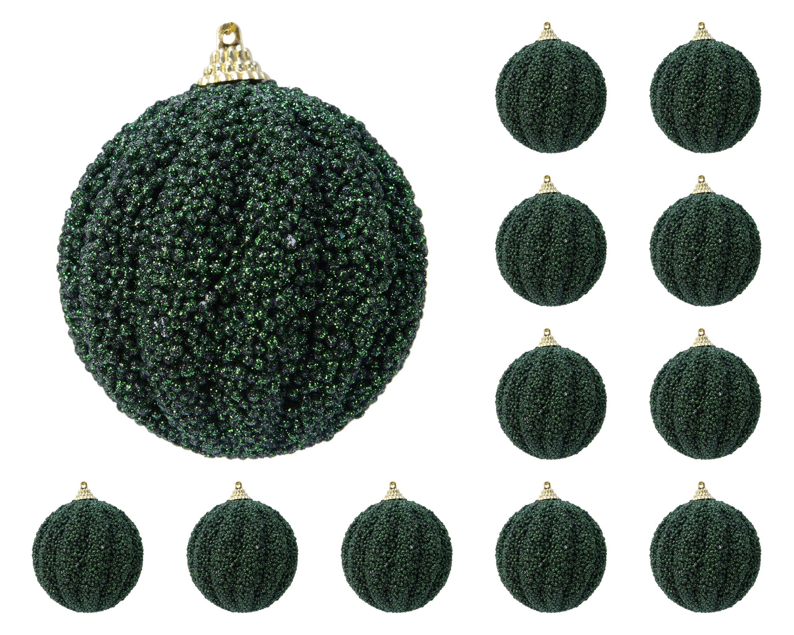 Christbaumkugeln / Weihnachtskugeln / Weihnachtsbaumkugeln Material: Kunststoff - Styropor - Durchmesser: ca. 8 cm - Packungsinhalt: 12 Christbaumkugeln - Farbton: tannengrün - waldgrün - weihnachtsgrün - strukturierte Oberfläche mit intensivem Glitzereffekt - ideal für rustikale oder elegante Weihnachtsbaum Deko Diese außergewöhnliche Christbaumkugel in Dunkelgrün überzeugt mit ihrer detailreich strukturierten Oberfläche, die mit feinen Mikrokügelchen und Glitzer beschichtet ist. Das ergibt einen faszinierenden Glanz- und Tiefeneffekt, der besonders im Licht zur Geltung kommt. Die aus Kunststoff gefertigte Kugel ist bruchsicher und somit bestens geeignet für Haushalte mit Kindern oder Haustieren. Sie lässt sich perfekt in klassische oder moderne Weihnachtsdekorationen integrieren – sowohl am Baum als auch in Tischgestecken oder Adventsarrangements. Die dekorative Oberfläche sorgt für eine besondere Haptik und ein hochwertiges Erscheinungsbild. Der intensive Glitzereffekt macht die Kugel zu einem echten Blickfang – ob solo, in Kombination mit Goldtönen oder natürlichen Elementen wie Holz oder Tannenzweigen. Figur & Form: Kugel, kugelförmig, rund - Stil & Aufmachung: strukturiert, glitzernd, glänzend, glamourös, modern, festlich - Farbgruppe: grün