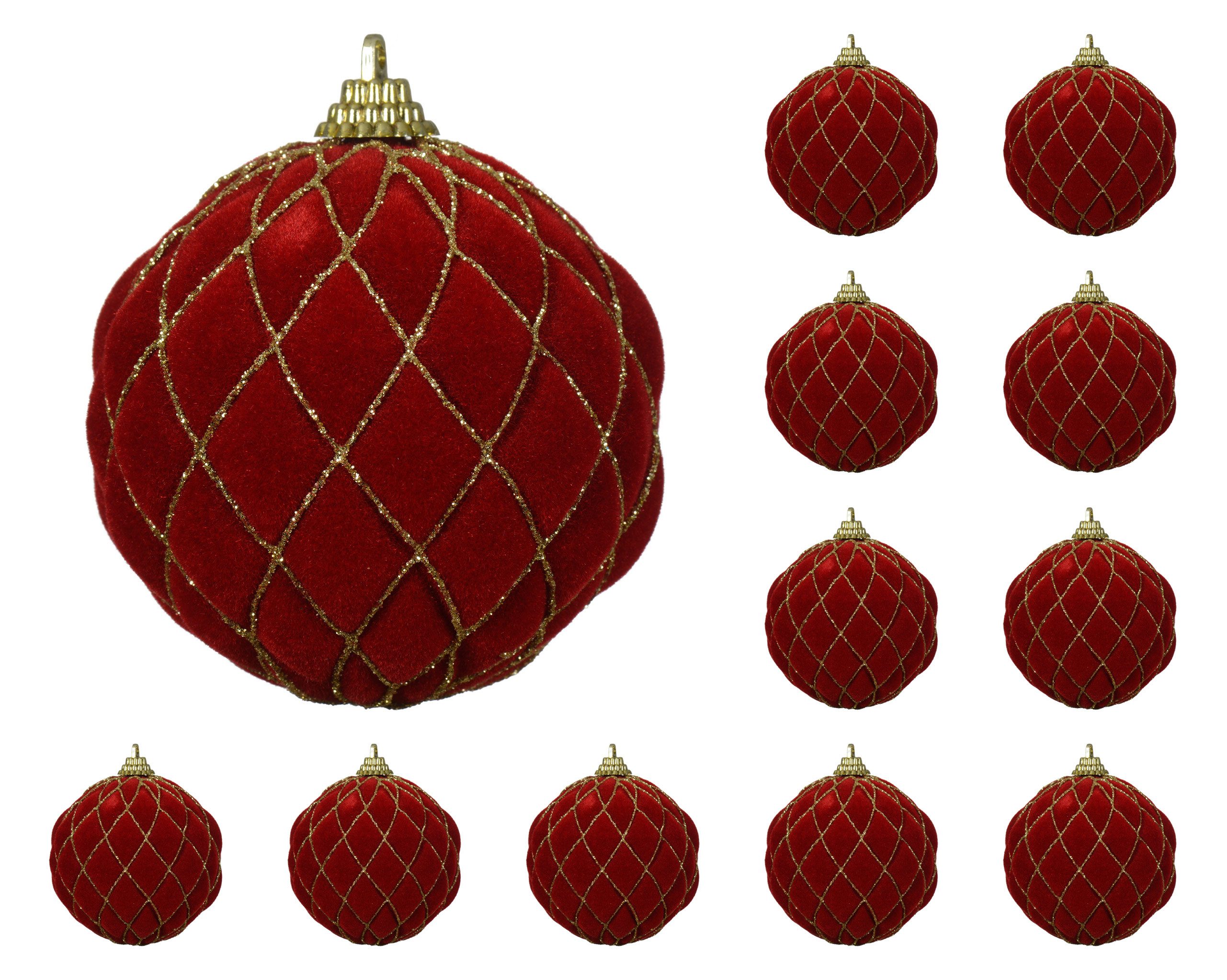 PRODUKT: Weihnachtskugeln Samt mit Rauten Muster / DURCHMESSER: ca. 8 cm / MATERIAL: Kunststoff, Textil / INHALT: 12 Kugeln / FARBE: rot - weihnachtsrot - gold