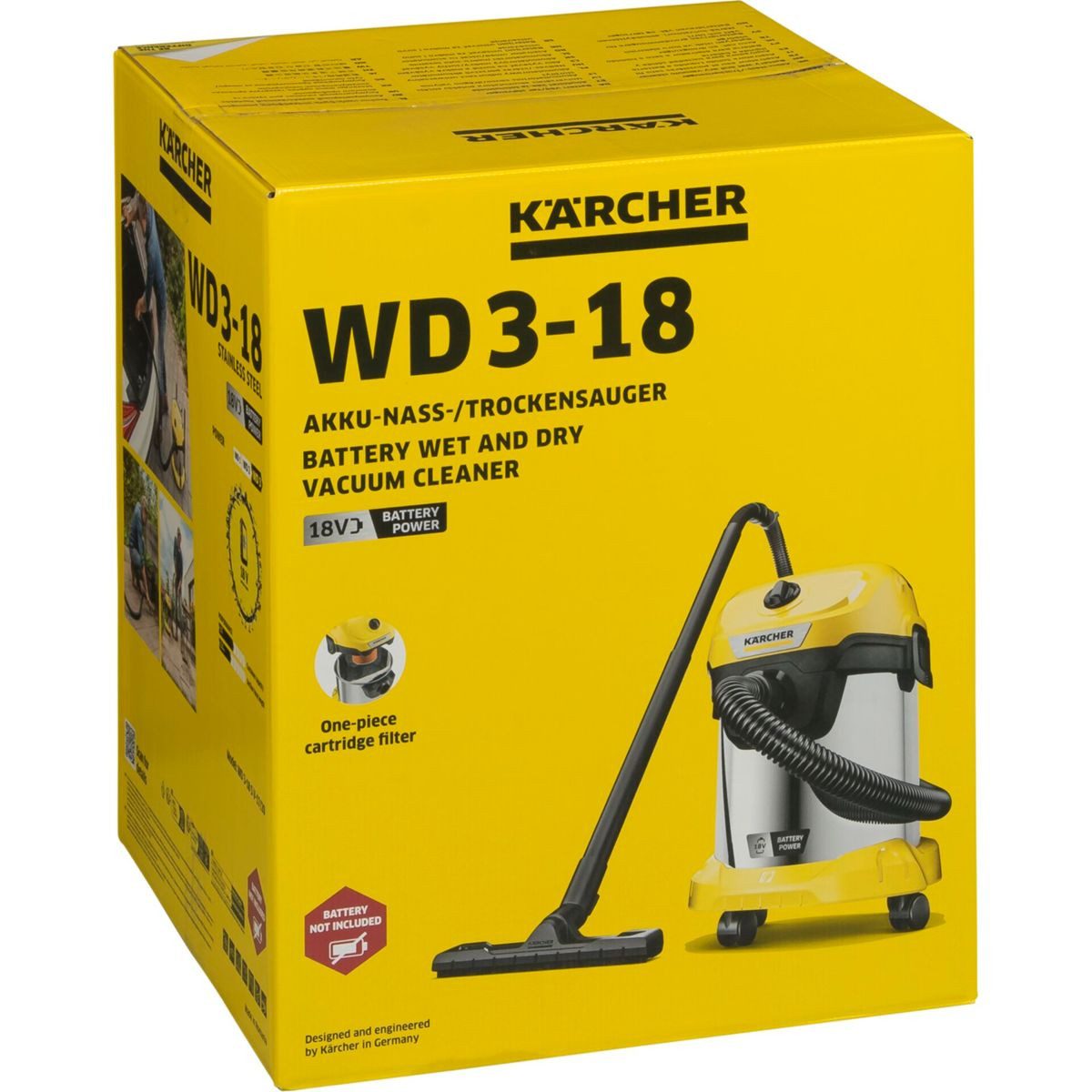 Mehr Bewegungsfreiheit, mehr Flexibilität: Der akkubetriebene Nass-/Trockensauger WD 3-18 S läuft auf der 18 V Kärcher Battery Power Akku-Plattform und ist schnell einsatzbereit. Das Gerät, der 2 Meter lange Saugschlauch und die Clips-Bodendüse sind optimal aufeinander abgestimmt und beseitigen nassen, feinen oder groben Schmutz im Handumdrehen.