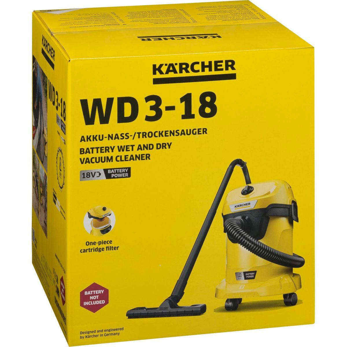 Der akkubetriebene 18 V Nass-/Trockensauger WD 3-18 Battery Set bietet maximale Flexibilität mit 17-l-Kunststoffbehälter, 2 m Saugschlauch, Blasfunktion und 1-teiligem Patronenfilter.