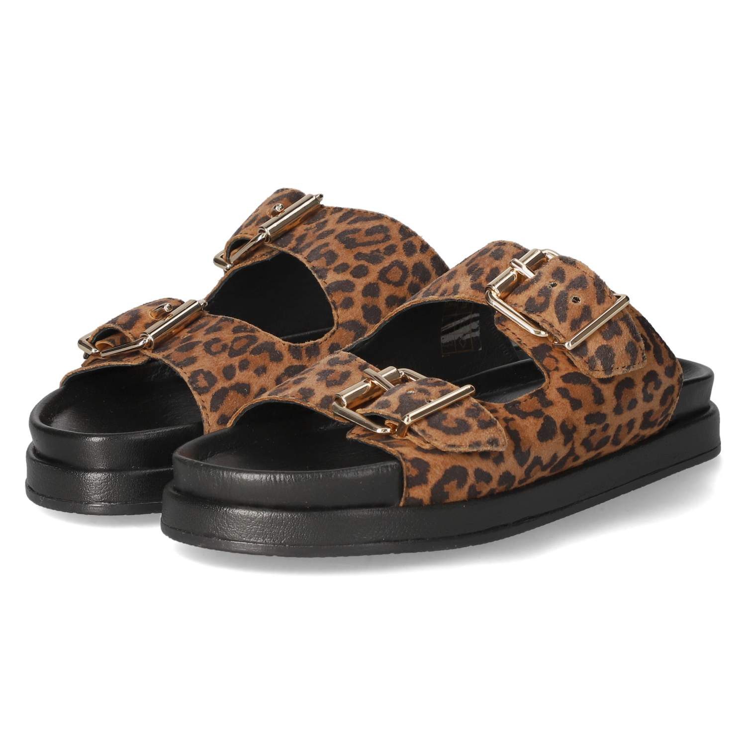 Die Kaerlek Damen Pantoletten in Beige aus weichem Rauleder präsentieren sich in angesagtem Animal Design und setzen damit modische Akzente. Zwei breite Zierriemen mit goldfarbenen, verstellbaren Schnallen bieten nicht nur einen stilvollen Look, sondern auch individuell anpassbaren Tragekomfort. Das gepolsterte Lederfußbett sorgt für ein besonders angenehmes Laufgefühl – ideal für warme Tage, an denen Bequemlichkeit gefragt ist. Die flexible und rutschhemmende Laufsohle rundet das durchdachte Design funktional ab und bietet sicheren Halt bei jedem Schritt. Diese Pantoletten vereinen modischen Chic mit hohem Komfort und sind ein perfekter Begleiter für Alltag und Freizeit.