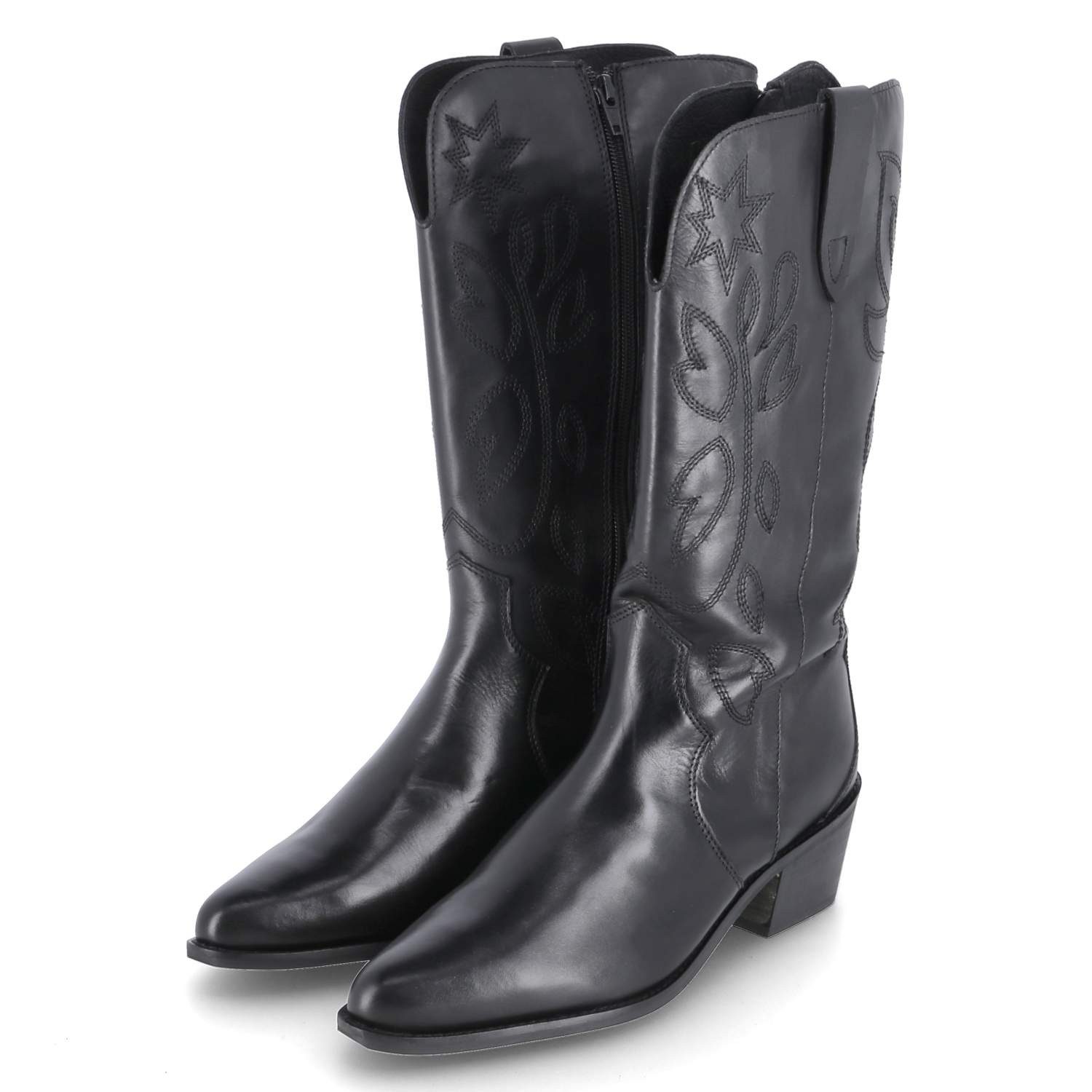 Die Kaerlek Damen Westernstiefel/Boots aus schwarzem Glattleder bieten einen stilvollen Western-Look mit praktischem Komfort. Der Schaft ist mit einem gestickten Muster verziert und verfügt über eine seitliche Anziehlasche sowie einen praktischen Reißverschluss, der das An- und Ausziehen erleichtert.