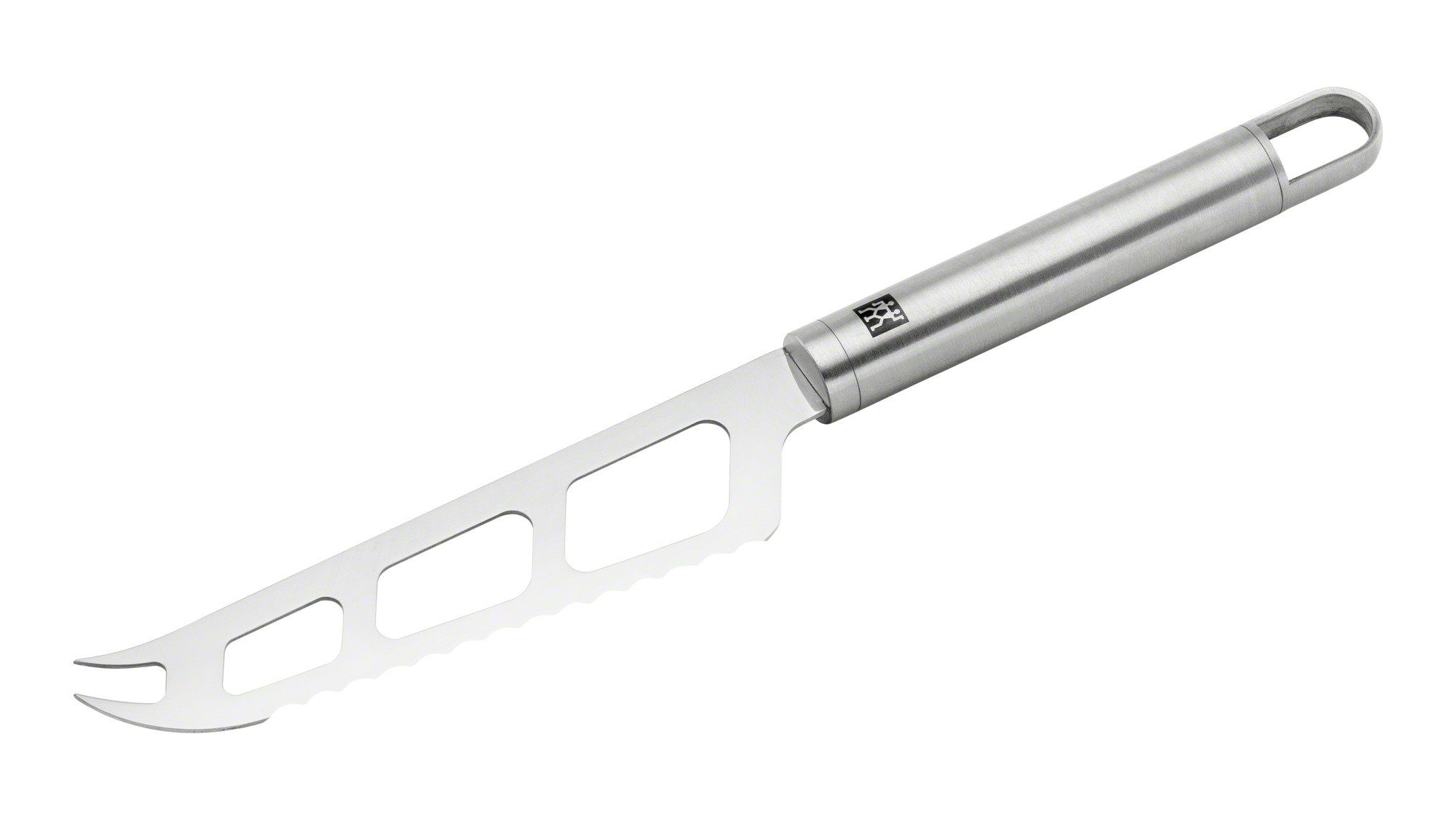 Zwilling Käsemesser ZWILLING® Pro 276 mm 10 6/7 " Guter Käse muss lange reifen, um sein volles Aroma zu entfalten – und hat es verdient, stilvoll geschnitten und serviert zu werden. Das Käsemesser aus der Serie Pro von ZWILLING ist der ideale Küchenhelfer für Käseliebhaber. Sie schneiden und servieren damit sowohl Weichkäse als auch Schnittkäse. Die scharfe Klinge mit Wellenschliff hat praktische Aussparungen, wodurch der Käse nicht hängen bleibt. Mit der Doppelspitze können Sie die Käsestücke bequem aufnehmen und anrichten. Da der Griff des Edelstahlmessers ergonomisch geformt ist, können Sie sehr lange damit arbeiten, ohne zu ermüden. Und nach der Arbeit können Sie Ihren Lieblingskäse und das besonders gelungene Design des Messers genießen. Minimalistisches Design von Matteo Thun und Antonio Rodriguez Hergestellt aus hochwertigem, rostfreiem Edelstahl Ergonomisch geformte Griffe für ermüdungsfreies Arbeiten mit fließenden Übergängen für besondere Hygiene Spülmaschinengeeignet Zum einfachen Schneiden von Schnittkäse