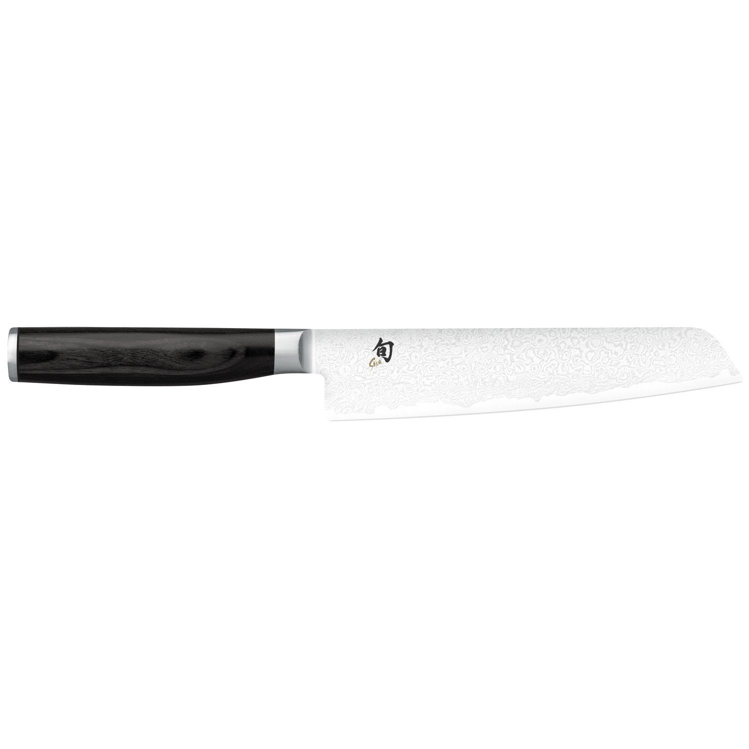 Die Shun Premier Tim Mälzer Minamo Serie stellt eine besonders elegante und eigenständige Erweiterung in die Premiumklasse der Shun Premier Messerserie dar. Die Messer sind von einer klaren Formensprache bestimmt: Der schwarze Griff aus Pakkaholz in Kombination mit der von Tim Mälzer selbst entwickelten Klingenform, die von einer feinen Damaszenermaserung geprägt ist, machen jedes Messer zu einem unverwechselbaren Einzelstück. Diese besondere Maserung, welche an eine Wasseroberfläche (jap. Minamo) im Regen erinnert, gibt der Serie ihren Namen. Der Klingenaufbau aus hartem Kern, ummantelt von flexiblerem Damaszenerstahl, sorgt für höchste Schärfe, lange Schnitthaltigkeit und ideale Performance. Das Allzweckmesser ist eine Mischung aus Schäl- und Kochmesser. Wer nur wenig schneidet oder gerade erst anfängt, Messer zu kaufen, liegt mit dem Allzweckmesser genau richtig. Das Messer hat eine Klingenlänge von 15 cm, der Griff ist 10,5 cm lang.