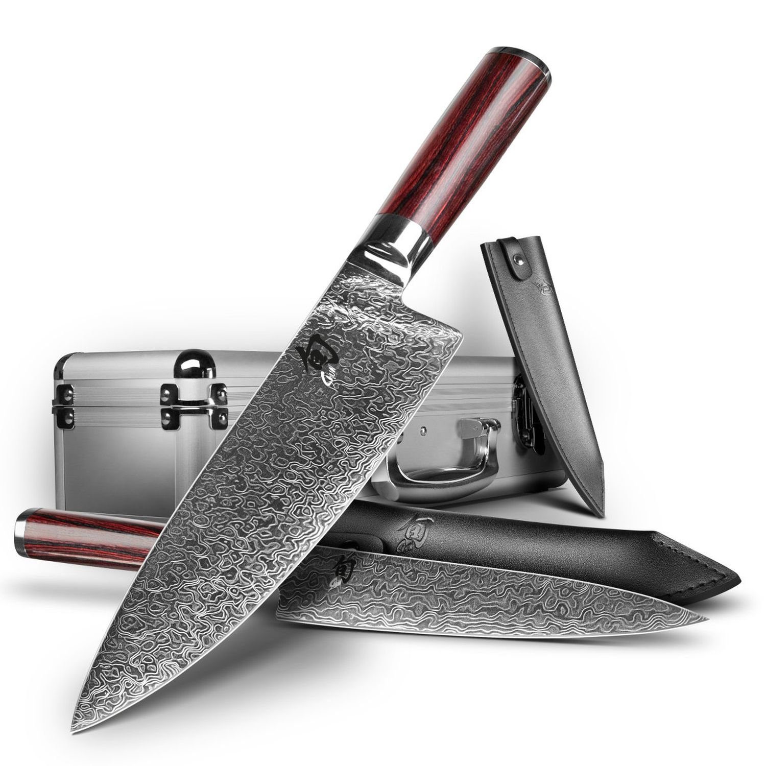 Das weltweit auf 6.000 Stuck limitierte Shun Kohen Anniversary-Set besteht aus dem Shun Allzweckmesser, dem Shun Kochmesser, jeweils einer passenden Lederscheide für beide Messer und einem hochwertigen Aluminium-Koffer. Die gesamte Klinge der Kochmesser aus der Shun-Serie von Kai ist aus VG MAX Stahl mit einer Härte von 61 (? 1) gefertigt, der mit 32 Lagen Damaszenerstahl ummantelt ist. Die stabile Klinge wird durch den Gebrauch dieser beiden Komponenten sehr hart und zugleich elastisch. Das Messer weist einen beidseitigen Schliff auf. Der Griff besteht aus tiefrot-schwarz gemasertem Pakkaholz und ist nach der traditionellen Kastanienform gestaltet, die für einen bequemen und sicheren Halt beim Schneiden sorgt. Das Kochmesser ist das