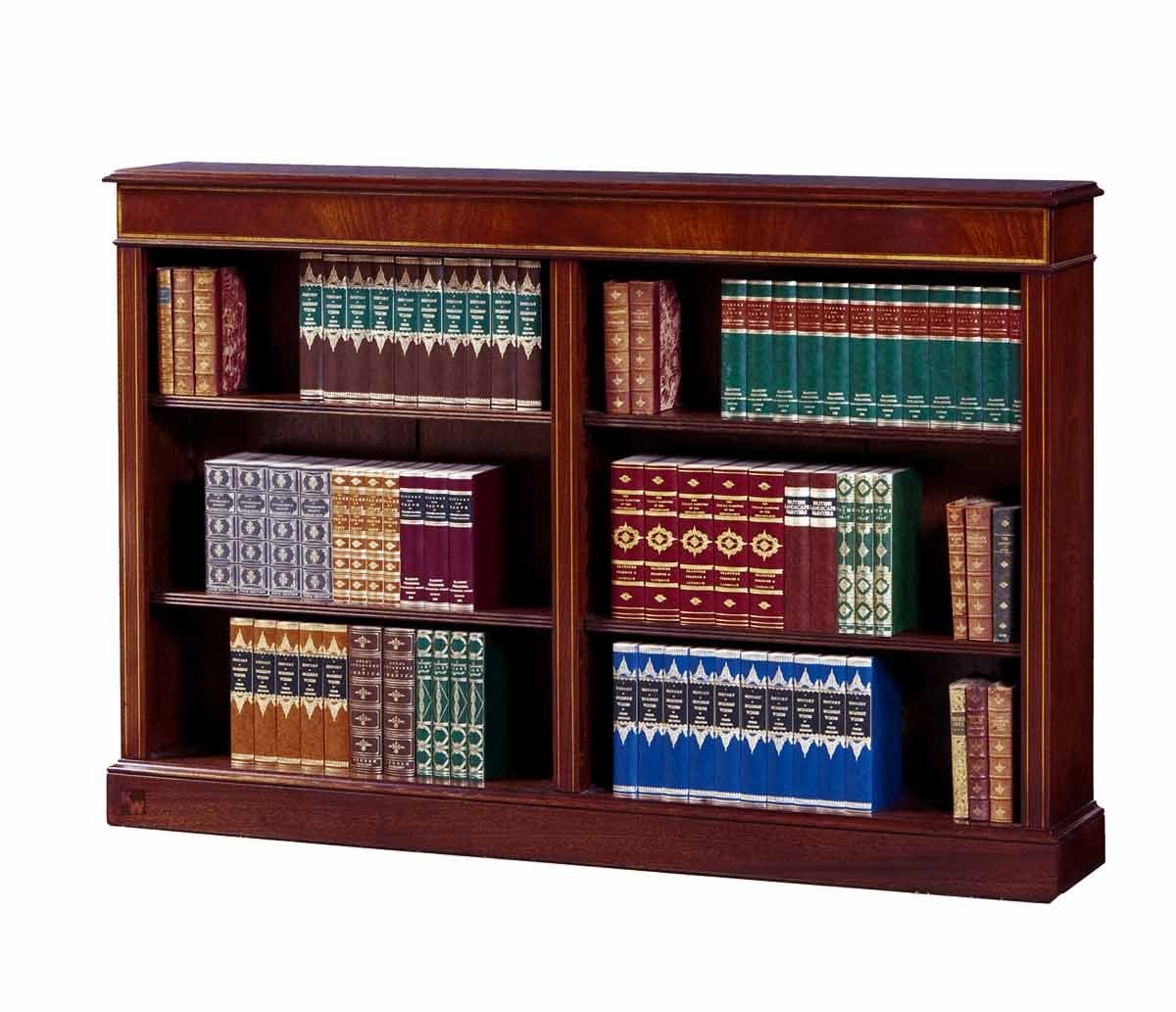 Das Bücherregal Catherine II besteht aus zwei offenen Segmenten und ist damit doppelt so breit wie seine “kleine Schwester” Catherine I. Auch hier können Sie sich auf hochwertiges Mahagonifurnier freuen, welches nach traditioneller englischer Handwerkskunst verarbeitet und mit liebevollen Details versehen wird. Dazu gehören etwa der geschlossene Sockel, die leicht abgestufte Deckplatte oder die quer zum Maserungsverlauf gelegten Bandintarsien aus Satinholz, welche wunderbar mit dem edlen Rotbraun harmonieren. Entscheiden Sie selbst, in welcher der zwei Fachboden-Tiefen (18 bzw. 30 cm) Sie das Regal wählen, um Aktenordner, Deko-Accessoires oder die Lieblingslektüre zu verwahren. So stilvoll kann Ordnung sein!