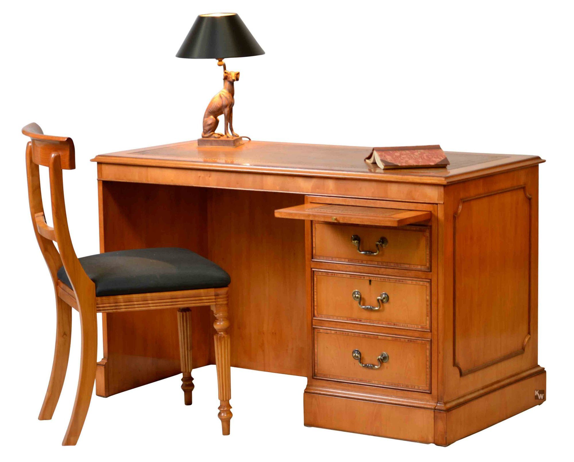 Dieser Schreibtisch ist aus edlem Eibefurnier gefertigt und überzeugt mit seiner klassisch-zeitlosen Optik. Die Tischhöhe von 75 cm ermöglicht eine ergonomische Arbeitshaltung beim Tippen, der Schubladencontainer lässt sich nach Bedarf umstellen oder herausnehmen und bietet viel Stauraum für Ihre Unterlagen. Die Schreibplatte aus Leder stellt eine angenehme Unterlage dar und findet sich beim ausziehbaren Ablagebrett wieder. Die Vorderseite des Tisches ist geschlossen, was neben Sichtschutz auch die Möglichkeit das Schreibmöbel frei im Raum aufzustellen. Bei diesem Stück dürfen Sie sich auf traditionelle Handwerkskunst “made in England” freuen. Samtweiche Oberflächen, liebevolle Details und eine Qualität, die ihresgleichen sucht. Ein Must-have für jedes stilvolle Office!