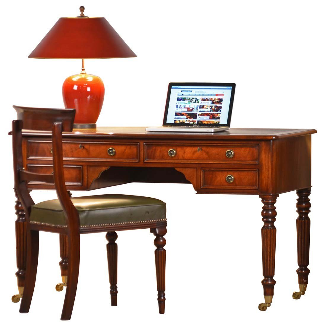 Dieser Victorian Writing Table besteht aus handpoliertem Mahagonifurnier und verleiht jedem Arbeitszimmer einen luxuriösen Anstrich. Dank seiner vier Messingrollen lässt er sich bei Bedarf umplatzieren, bringt aber ein ausreichend hohes Eigengewicht mit, um bei der Büroarbeit nicht einfach davonzurollen. Wer seinen Papierkram sicher verstauen möchte, sorgt mithilfe der vier Schubladen (davon zwei abschließbar) im Handumdrehen für Ordnung. Natürlich weiß der Damenschreibtisch auch optisch zu gefallen, wie man an den liebevollen Details erkennt: Dazu gehören die mit Prägestempeln umlaufend gepunzte Ledereinlage, die abgerundete Deckplatte sowie die antik patinierten Messinggriffe, hier stilgerecht kreisrund und in der Fachsprache als “Ring Handle” bekannt. Holen Sie sich ein Stück viktorianische Geschichte nach Hause, neu interpretiert und handwerklich unübertroffen!