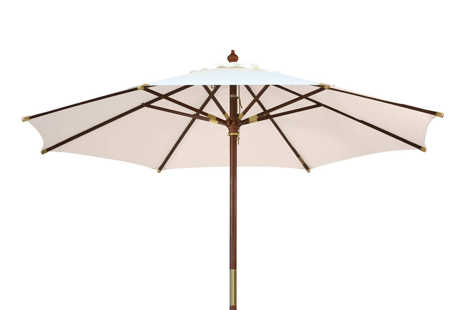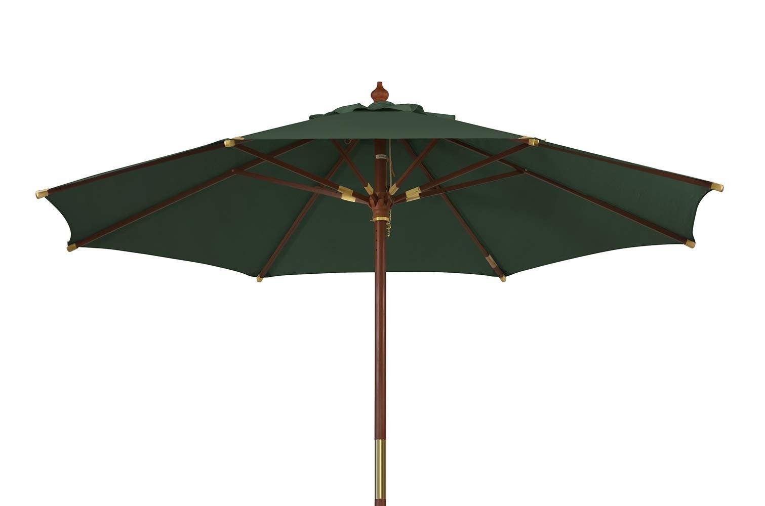 Der Balkon-Schirm überzeugt mit Qualität, einem unschlagbaren Preis-Leistungs-Verhältnis und tollen Extras. Das dichte Schirmtuch aus 100 % Polyester sorgt für einen hohen Sonnenschutz UPF 50+, ist flecken- & wasserabweisend und lässt sich abnehmen, sodass man es bei Bedarf einfach in der Waschmaschine reinigen kann. Rostfreie Messingschrauben und Leder verstärkte Stoffecken sorgen hier für perfekten Halt. Mast und Gestänge sind aus bruchsicherem Raminholz, lediglich der Schieber und die Schirmspitze sind aus Kunststoff. An dieser Stelle hat sich Massivholz nicht bewährt. Der Holzmast ist wetterimprägniert und lässt sich teilen, sodass sich der Rundschirm leicht transportieren und verstauen lässt. Dank des Windauslasses steht der Terrassenschirm auch bei aufkommenden Windböen fest. Öffnen lässt sich der Marktschirm über einen unkomplizierten Seilzug. Puristen werden diesen klassischen Mittelmastschirm aus Holz lieben, der mit mediterranem Charme bezaubert!