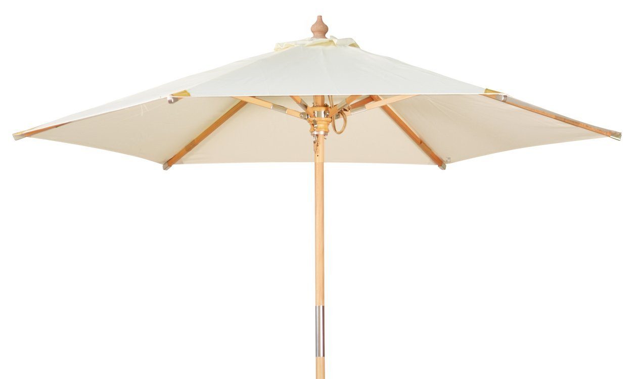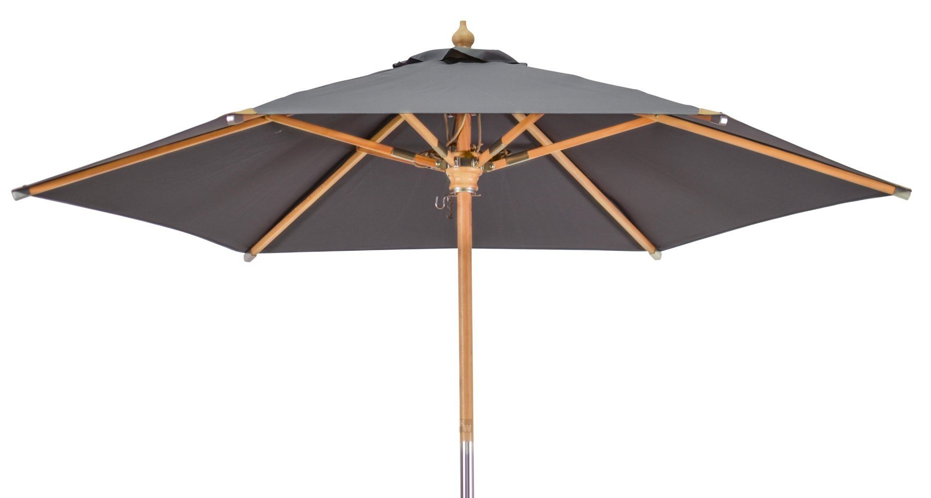 Der Balkon-Schirm überzeugt durch seine exklusive Optik und die grandiose Produktqualität. Der dichte Polyesterbezug sorgt für einen hohen UV-Schutz 50+ und die lederverstärkten Tuchenden sind mit Schrauben befestigt, sodass das Tuch selbst bei stärkster Belastung nicht einreißen kann. Mast und Gestänge sind aus bruchsicherem Raminholz, lediglich die Schirmspitze ist aus Kunststoff. An dieser Stelle hat sich Massivholz nicht bewährt. Sämtliche Beschläge des Terrassenschirms sind aus rostfreiem Edelstahl und jede Strebe ist separat verschraubt, sodass sie bei Bedarf leicht ausgetauscht werden können. Der Windauslass sowie die flecken- & wasserabweisende Bespannung machen ihn zum perfekten Schattenspender im Garten, auf dem Balkon oder der Terrasse. Der wetterimprägnierte Mast ist zudem teilbar, sodass er leicht zu transportieren und verstauen ist. Öffnen lässt sich der Rundschirm über einen unkomplizierten Seilzug. Puristen werden diesen stylischen Mittelmastschirm aus Holz lieben, der mit modernem Charme bezaubert!