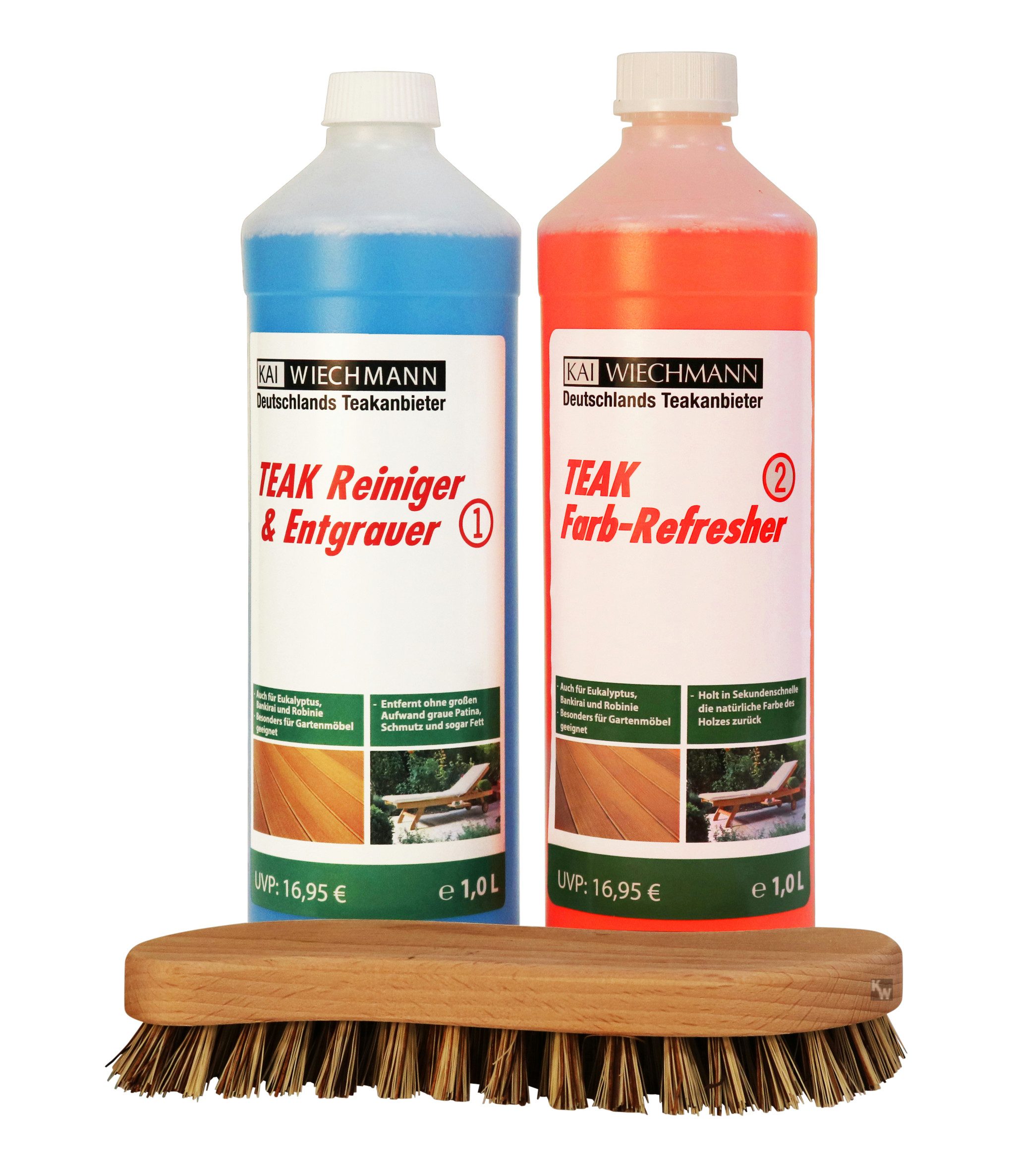 Dieses Teakholz Pflegeset beinhaltet eine 1L-Flasche des Teak Entgrauers, eine 1L-Flasche des Teak Farb-Refreshers sowie eine Wurzelbürste.