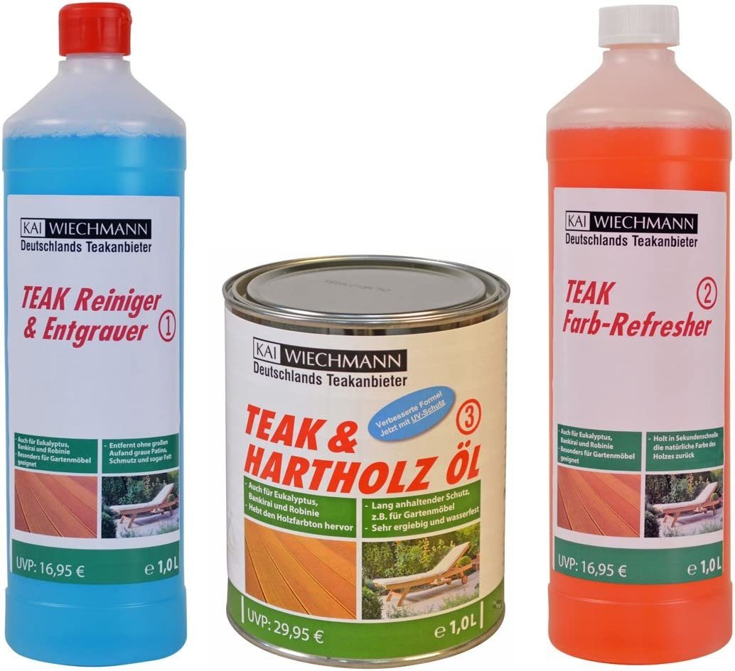 Dieses Teakholz Pflegeset beinhaltet eine 1L-Flasche des Teak Entgrauers, eine 1L-Flasche des Teak Farb-Refreshers sowie eine 1L-Dose des Teak- & Hartholz Öls.