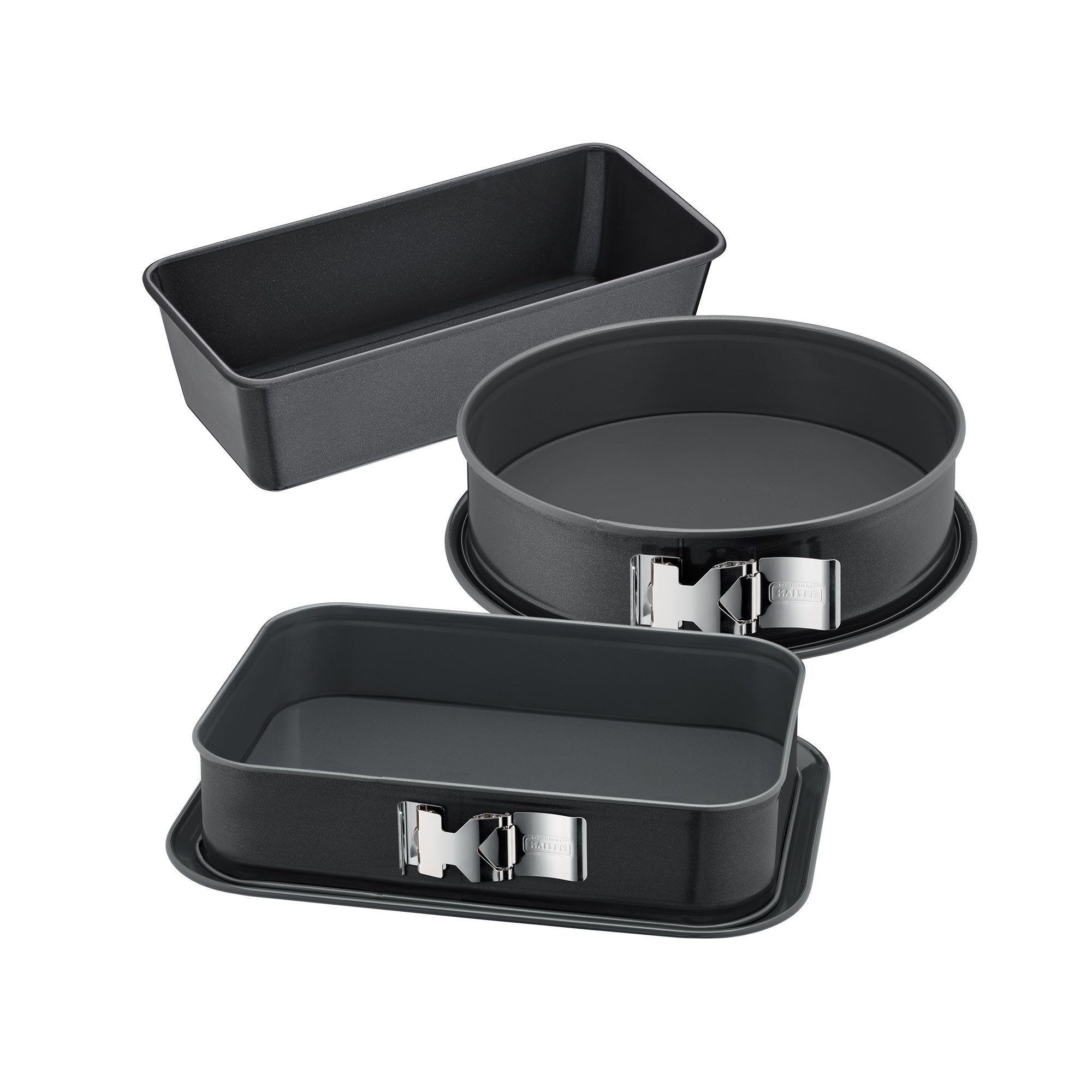 Bei einer Springform lässt sich mithilfe eines Spannhebels die Seitenwand lösen: Der Ring öffnet sich, und Sie können den Boden der Form herausnehmen und auch wieder einspannen. Mit einem flachen Boden gelingen in der Springform Kuchen und Tortenböden. Der Boden mit zentralem Kamin ersetzt eine Kranzform für Rührkuchen und Gugelhupf. Im Gegensatz zu anderen Backformen wird der fertig gebackene Kuchen aus der Springform nicht gestürzt. Stattdessen lösen Sie den Spannhebel – der Kuchen löst sich dank der Antihaftbeschichtung von ganz allein – und heben den Ring nach oben hin weg. Da das untere Trägerblech etwas größer ist als der Ring, sind Springbackformen absolut auslaufsicher. Es gibt sie in verschiedenen Größen und Formen, zum Beispiel rund, eckig oder in Herzform. Entscheidend für die Funktion jeder Springform ist ihr Verschluss. Daher hat Kaiser den neuen SafeClicK Mechanismus entwickelt, mit dem die Springformen der Serie La Forme Plus absolut auslaufsicher sind. Sie lassen sich dank einer vergrößerten, ergonomisch optimierten Grifffläche leichter öffnen und schließen als Backformen mit gewöhnlichem Spannhebel – ideal für Links- und Rechtshänder. Ins Auge fällt auch die formschöne "K"-Optik des Spannhebels.