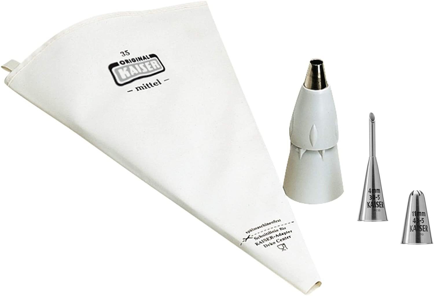 Das Kaiser Spritzbeutelset besteht einem reißfester Spritzbeutel 35 cm, ein Adapter und 3 verschiedenen (aus einem Stück gezogenen) Edelstahltüllen, welche aus hochwertigen Materialien hergestellt wurden und durch ein edles Design in Profi-Qualität überzeugt. Der kochfeste, strapazierfähige Spritzbeutel ist aus Baumwolle mit beschichteter Innenseite und kann in der Spülmaschine gereinigt werden. Er überzeugt mit seinem großen Füllvolumen und seiner einfachen Handhabung für Sahne, Cremes, Kuvertüre, Zuckerguss oderTeig. Die Edelstahltüllen sind falzfrei verarbeitet und ebenfalls spülmaschinenfest. Mit diesem Backzubehör können im Handumdrehen Kuchen und Torten verziert, schöne Nachtische und Schnittchen anrichtet werden oder der Spritzbeutel Mehrweg wird ganz klassisch als Spritzbeutel für Spritzgebäck verwendet.