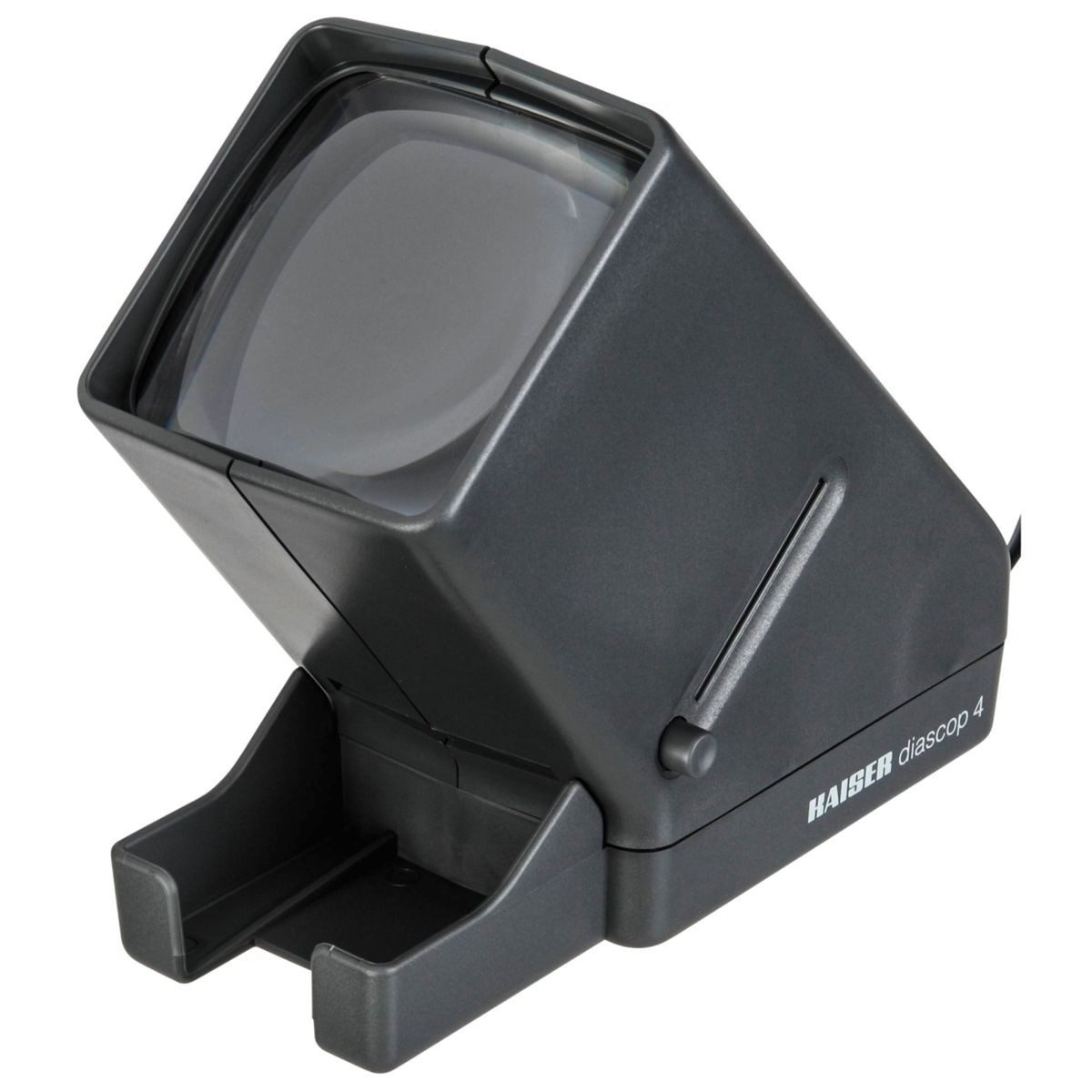 Dia-Betrachter mit 3fach vergrößernder Doppellinse für gerahmte Dias 5x5 cm und ungeschnittene Filmstreifen in Schutztasche. Fallschacht mit Auffangschale.